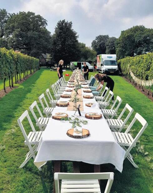 Dewijngaardligtin een parkachtige omgeving. Vanaf hetterraskijk jeop de straalsgewijsaangebrachterijen en jezit middenin denatuur. Henk: ''Jehoortde groenespechten zietdezon achter oude eikenwallen ondergaan. Belangstellenden kunnen vrij rondlopen en genieten.''