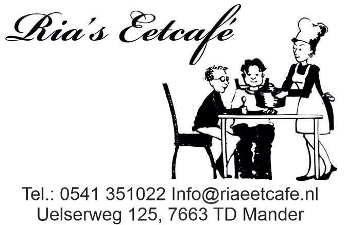 Bij Ria'sEetcafékun jenaeen mooiewandelingoffietstocht in deomgevingnatuurlijk ook terechtvoor een lekkerelunch en koffiemetmonchou- of appelgebak. Ria'sEetcaféschenkt bovendien een lekker wijntjebij heteten. Dewijnkaart vermeldtzeven soorten, waaronder witteen rodewijn en Chardonnier. www.riaseetcafe.nl