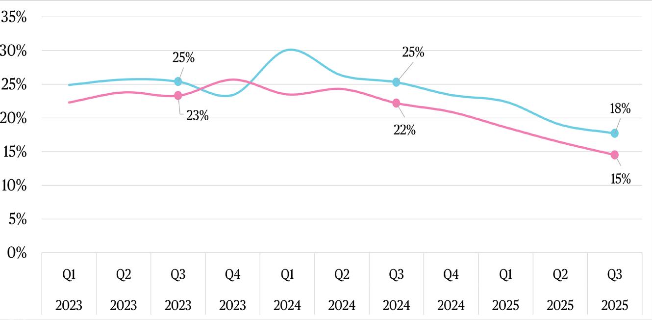 Class A availability rates in Flatiron and NoMad decreased for the sixth consecutive quarter. In Q3 2025, Class A availability fell to 18%, a significant decrease from its peak of 30% in Q1 2024. Class B availability also fell, decreasing to just 15%.