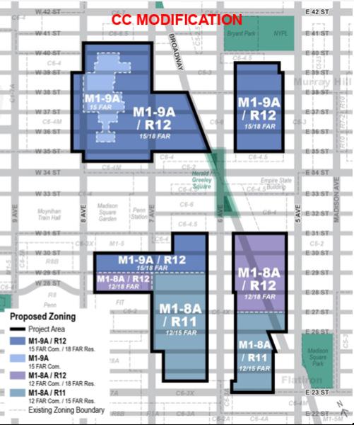The final plan amended proposed zoning for the Southeast Quadrant, which includes parts of Flatiron and NoMad (outlined in red in the image below). Instead of zoning the entirety of the Southeast Quadrant as R12, which would allow for 18 FAR, the Southeast Quadrant now has two zoning designations. The northern half of the quadrant allows the denser 18 FAR zoning, while the southern half will be rezoned as R11, which allows for 15 FAR.