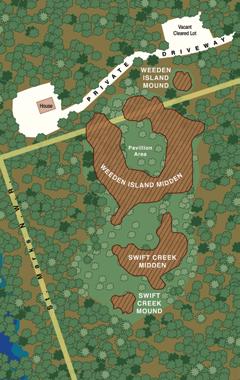The Byrd Hammock site has its origins between approximately 450 C.E. and 650 C.E and was occupied for over 1,500 years. Despite the incredible amount of change that has occurred over a millennium and a half, Byrd Hammock remains an important archaeological site that has the potential to contribute to our understanding of the past. The site was occupied by two distinct but subsequent phases of occupation. These two consecutive cultural periods represented at the site, Swift Creek and Weeden Island, occur in distinct physical spaces, each with its own paired set of features: a ring midden and a shell mound. A ring midden is the accumulated debris left behind by human activity typically consisting of shells, bones, and pottery. Shell mounds also accrued debris however they may have