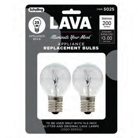 25 WATT BULB 2PK 502506P0US • $3.00 • 6 pc min • Item size: 4.5’’ Tall 25 Watt bulb 2pk • This bulb works in 14.5″/ 20 oz. Lava® lamps.