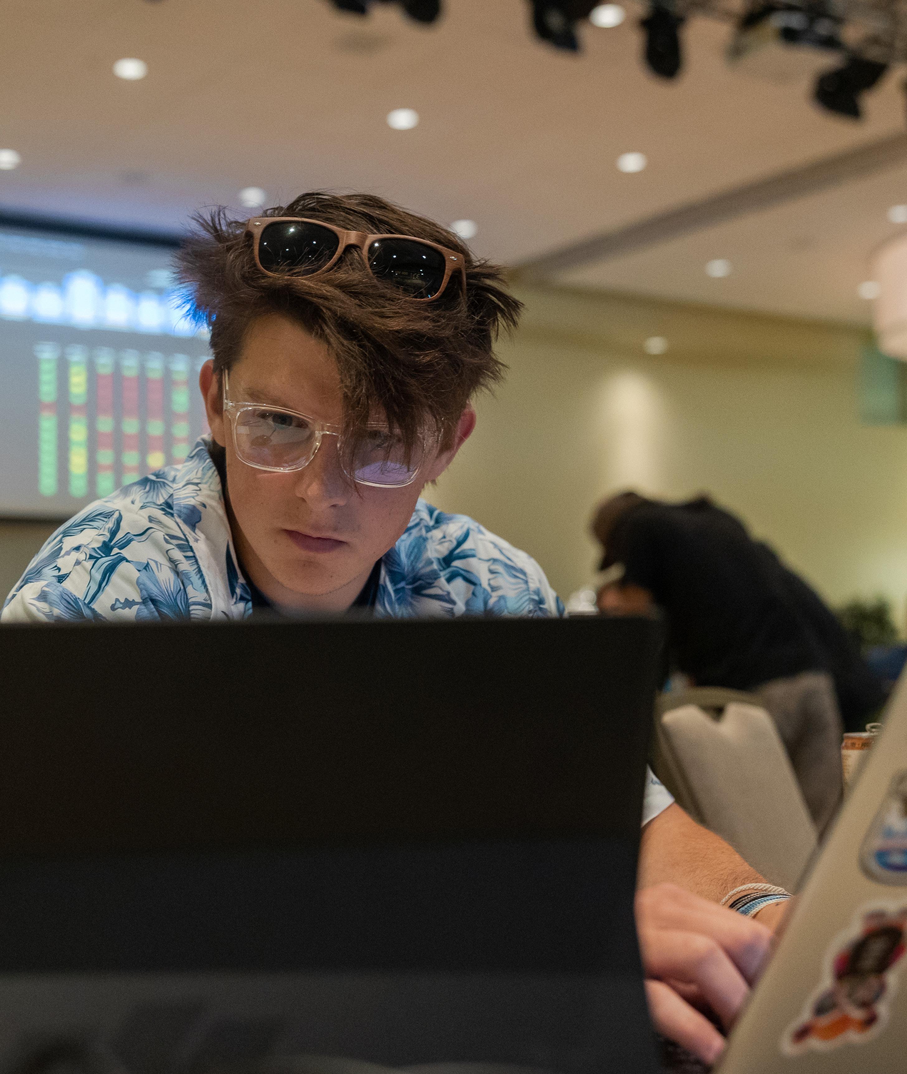 A Liberty University student studies the challenges on day two of the 2024 NCAE Cyber Games at the USF campus in Tampa.