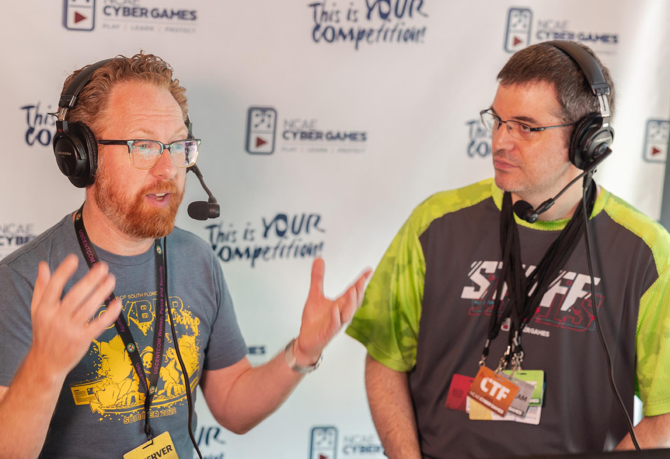 James Rice (right) and Dr. Nate Fisk break down the action on day two of the 2024 NCAE Cyber Games.
