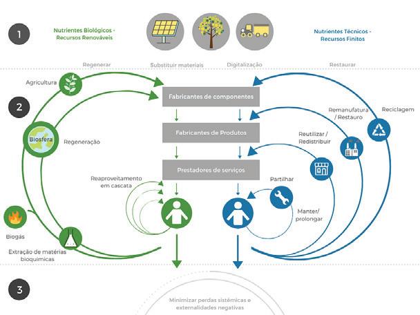 Baseia-se em três princípios (Ellen MacArthur Foundation, 2015): • Acabar com o desperdício e com a poluição; • Manter produtos e materiais em uso; • Regenerar os sistemas naturais.