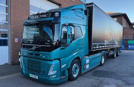 weighs 250kg and 80% of the power available from the lithium-ion packs can be used at any one time. The overall power is rated at 666hp with 2,400 Nm of 100% torque. Up to 300km is achievable on range distance, that is when fully loaded and driving on motorways at less than 90kp/h. Compared to its diesel compatriot, the eFM BEV tractor-unit version, with Globetrotter cab spec, weighs in two tonnes heavier. As test driven, the eFM was combined with a twin-axle rear steer Krone box trailer, enabling up to 17 tonnes to be loaded on board. Both the eFM and eFH electric trucks are fitted with alloy wheels and air suspension to help reduce weight, with the FH weighing 150 kg heavier than the