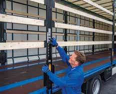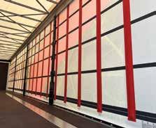 to a standard side curtain without the need for additional steel, aluminium and plastic reinforcements. This means that the load is held even more safely, preventing the load from tipping and the curtain from bulging, as well as delays in unloading and/or damage to the goods, which not only significantly increases the stability and service life of the curtain, but also makes the structure much more stable. The need to re-tighten the vertical curtain tensioners is also reduced. The vertical tensioners are protected by a curtain pocket. These tarpaulin pockets prevent damage during loading and unloading and are highlighted in colour to indicate the special nature of the tarpaulin.