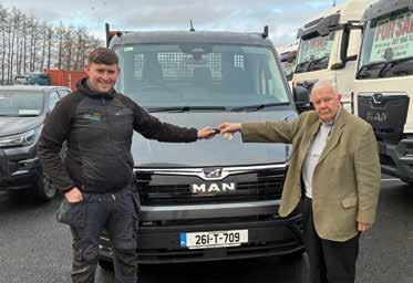This new TGE MAN 5.160 with tipper body was sold to JMJ Eco-Hire, based at Holycross, County Tipperary. Pictured is Jack Ryan, Managing Director, JMJ Eco-Hire receiving the key from Martin Hough, Sales Executive at Dennehy Commercials. The company specialises in producing solar powered mobile welfare units for construction crews.