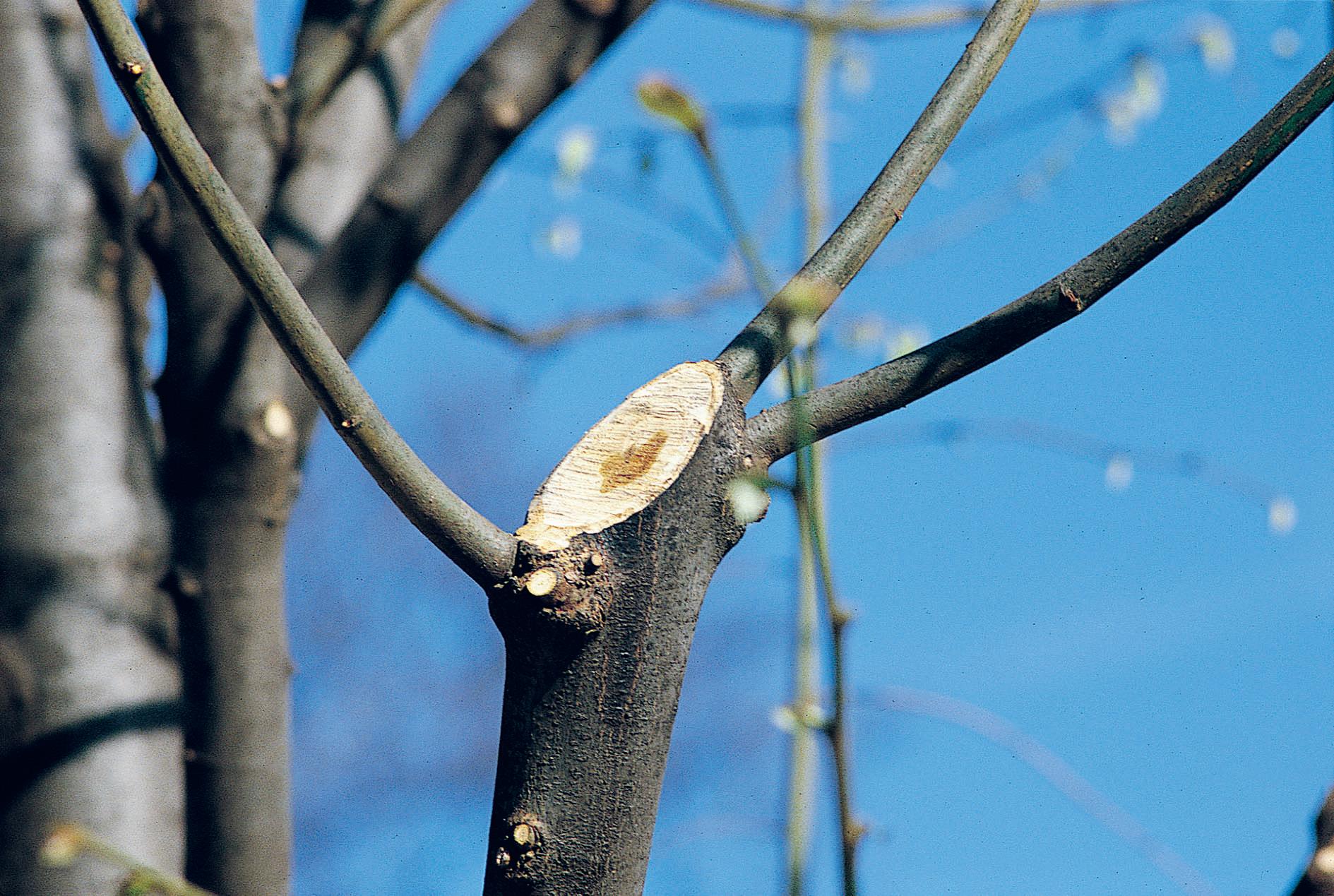 C’est l’un des aspects les plus importants de la taille. De nombreuses maladies se développent en effet facilement sur les branches abîmées des arbres et des arbustes, puis s’étendent vers les parties saines, entraînant parfois la mort du sujet. Toutes les branches cassées, ou dont l’écorce est endommagée, sont donc à considérer comme des foyers d’infection potentiels. Coupez de façon systématique le bois mort, cassé ou abîmé, au niveau d’une partie saine.