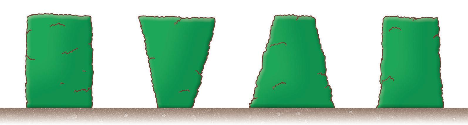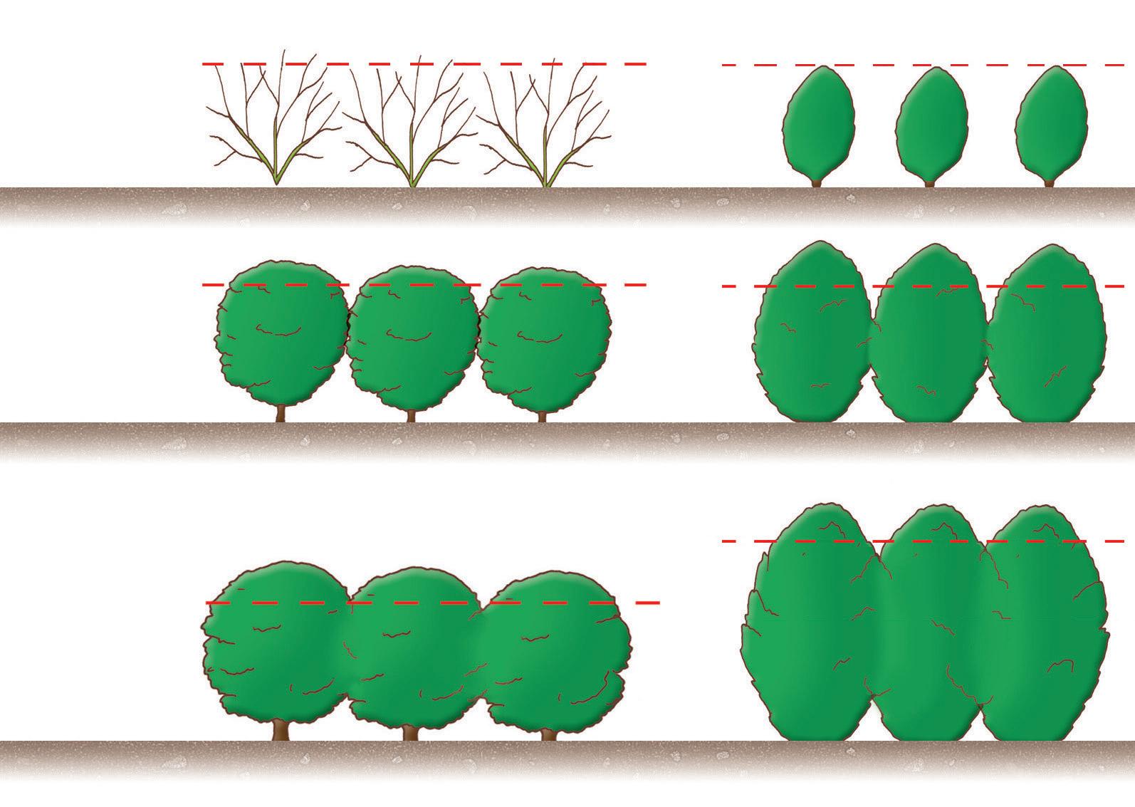 Idéalement, une haie doit être plus large en bas qu’en haut ; ainsi, la lumière parvient jusqu’aux branches de la base et permet la formation d’une ramure dense. h
