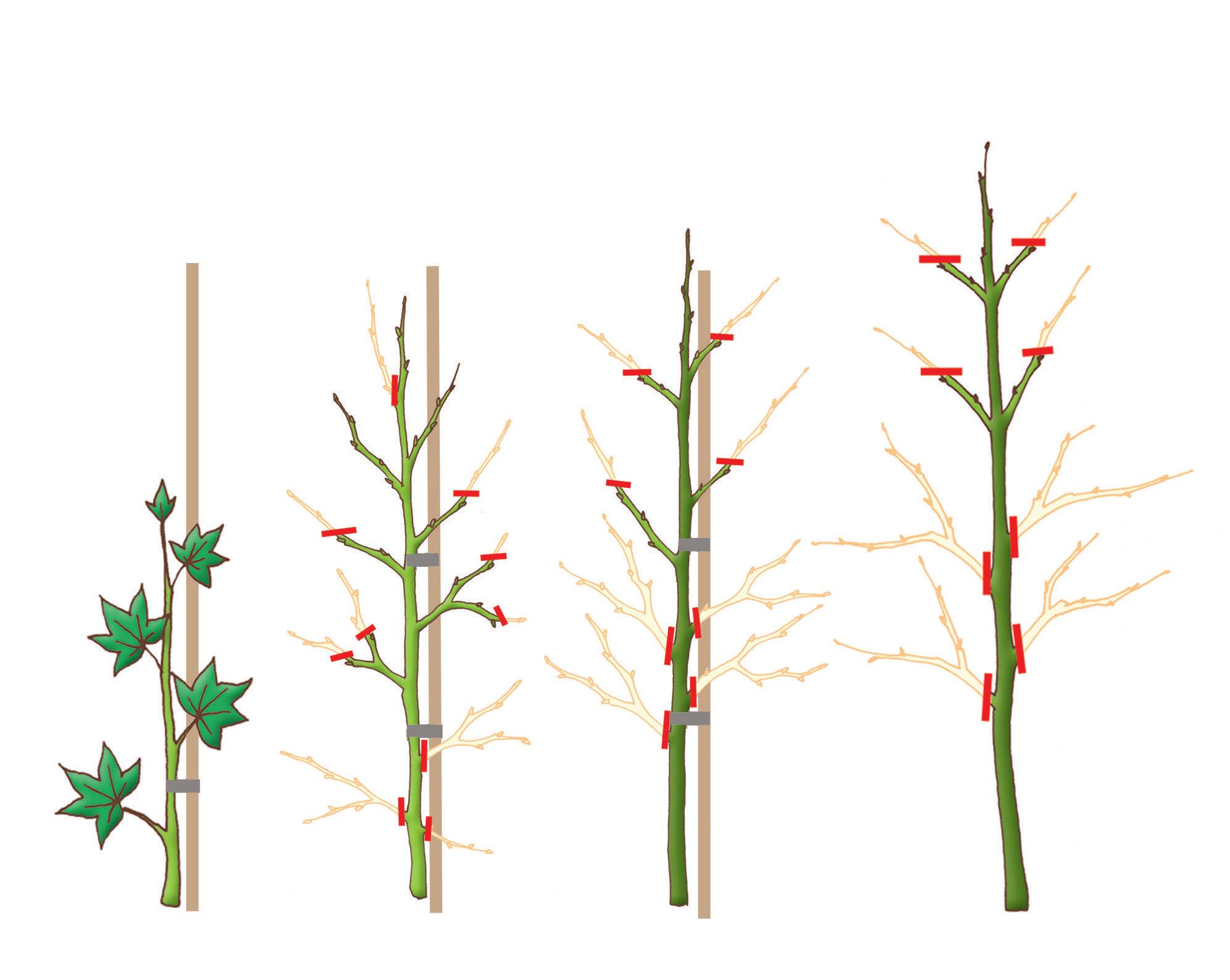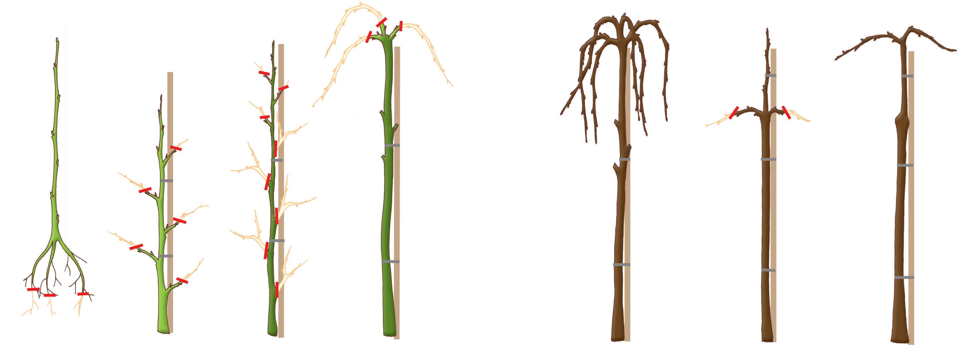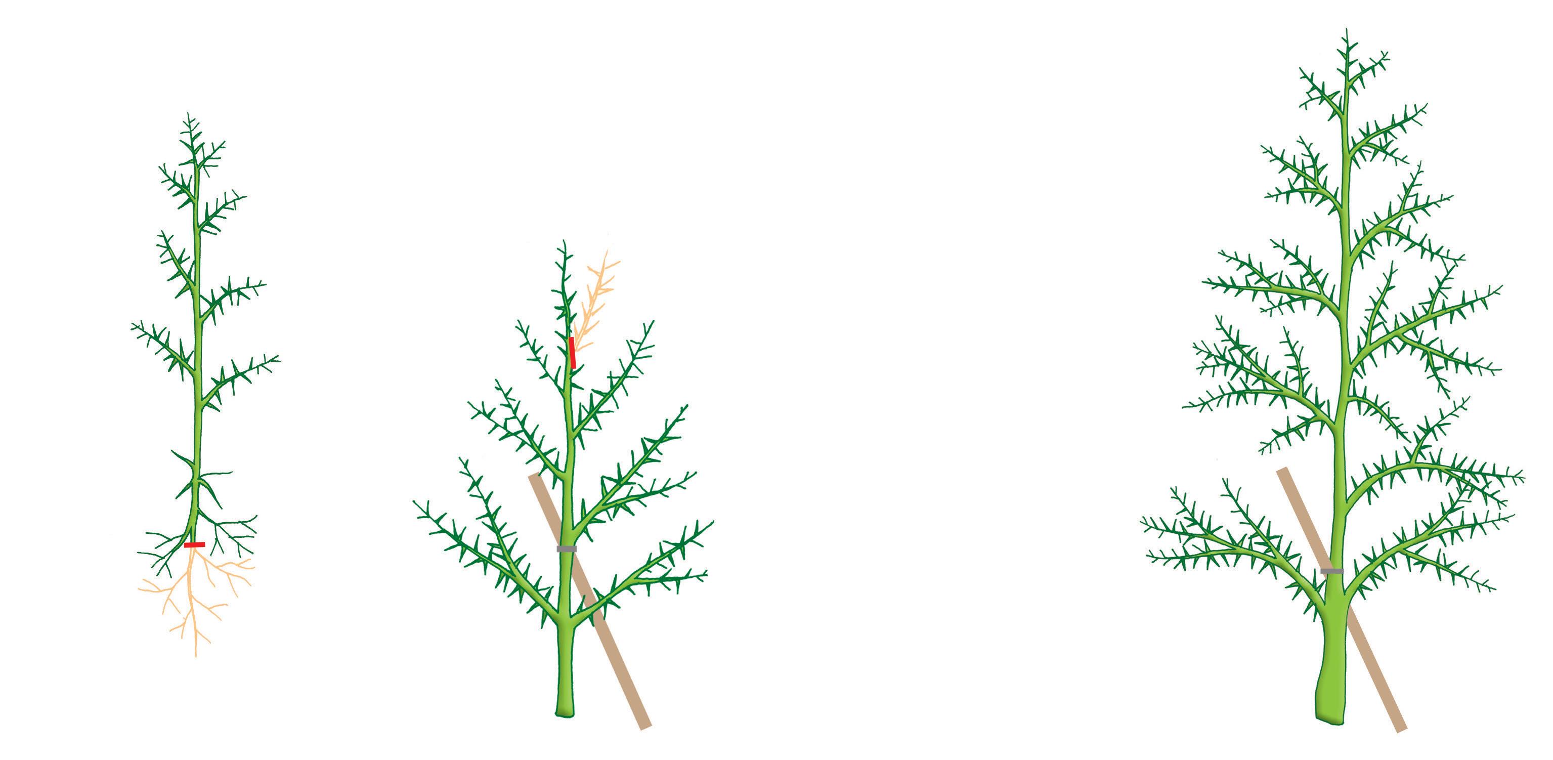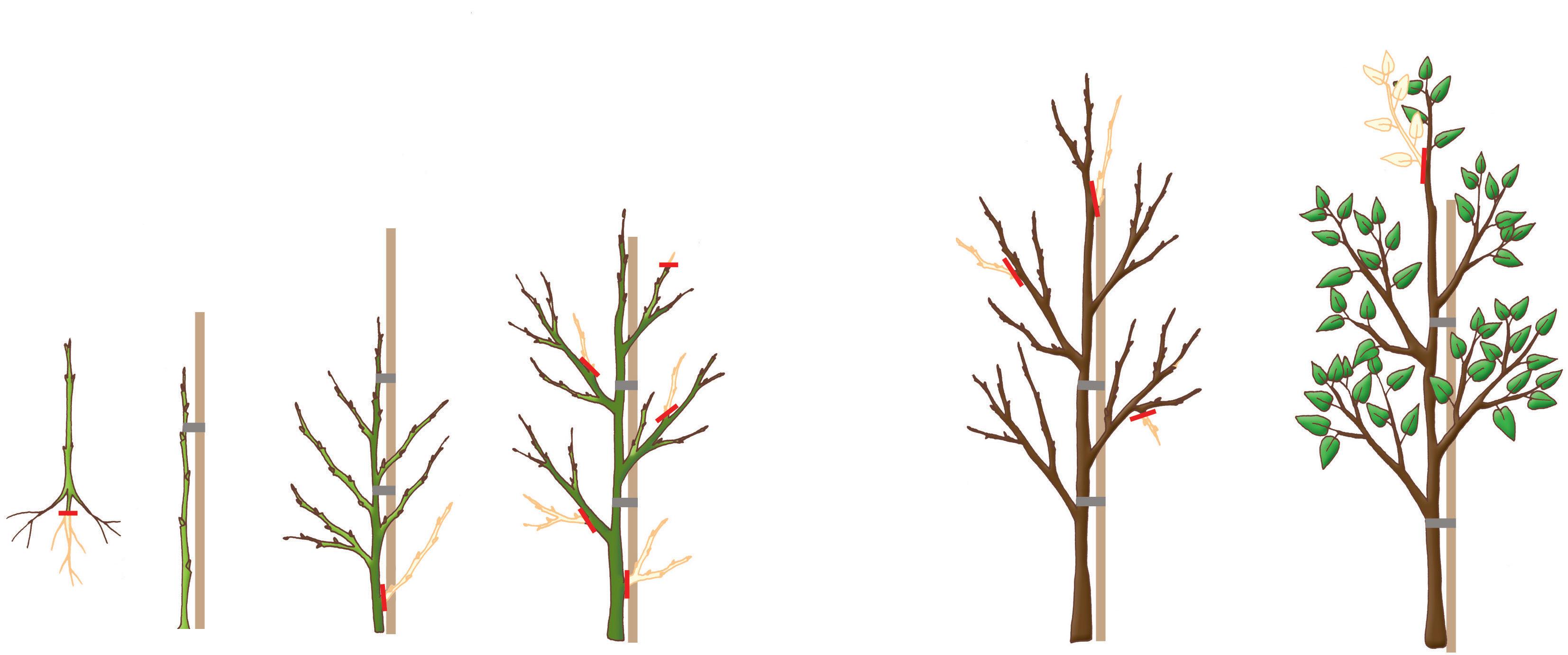 6 et 7 Si l’arbre ne développe pas spontanément des pousses terminales, accolez au tuteur la pousse centrale la plus longue. Continuez à rabattre chaque année les pousses jusqu’à ce que l’arbre ait atteint la hauteur souhaitée.