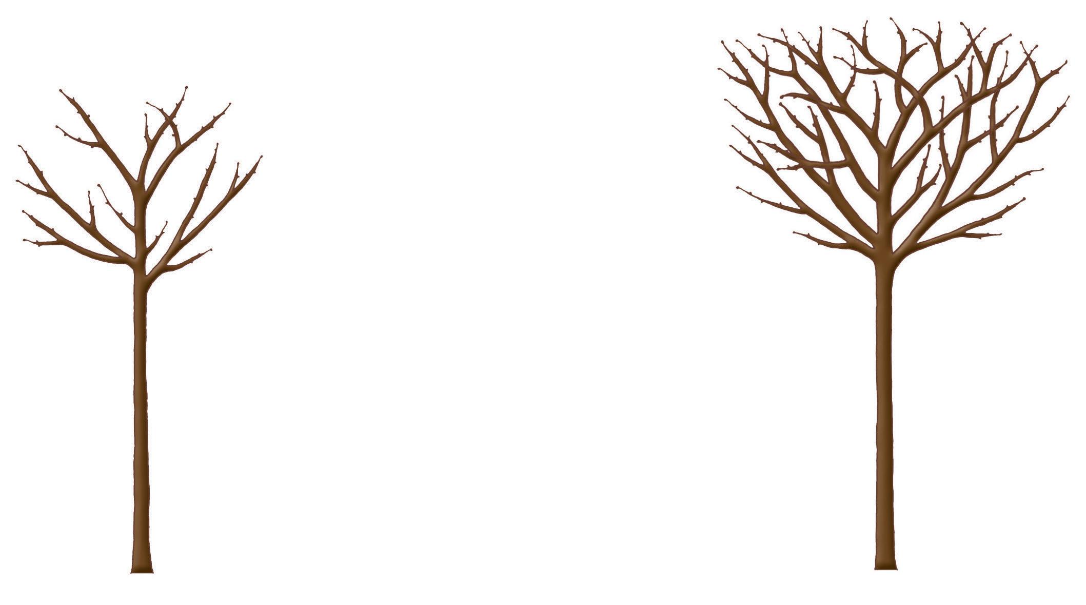Les arbres ainsi taillés ont une ramure évasée et un centre bien dégagé. Rabattez l’axe central sur les premières branches latérales. Sélectionnez 3 ou 4 branches latérales régulièrement espacées et supprimez les autres ; ce seront les branches charpentières de l’arbre. Raccourcissez-les de moitié sur un œil tourné vers l’extérieur. Par la suite, rabattez les rameaux latéraux qui se sont formés sur les charpentières pour assurer à l’arbre adulte une charpente équilibrée.