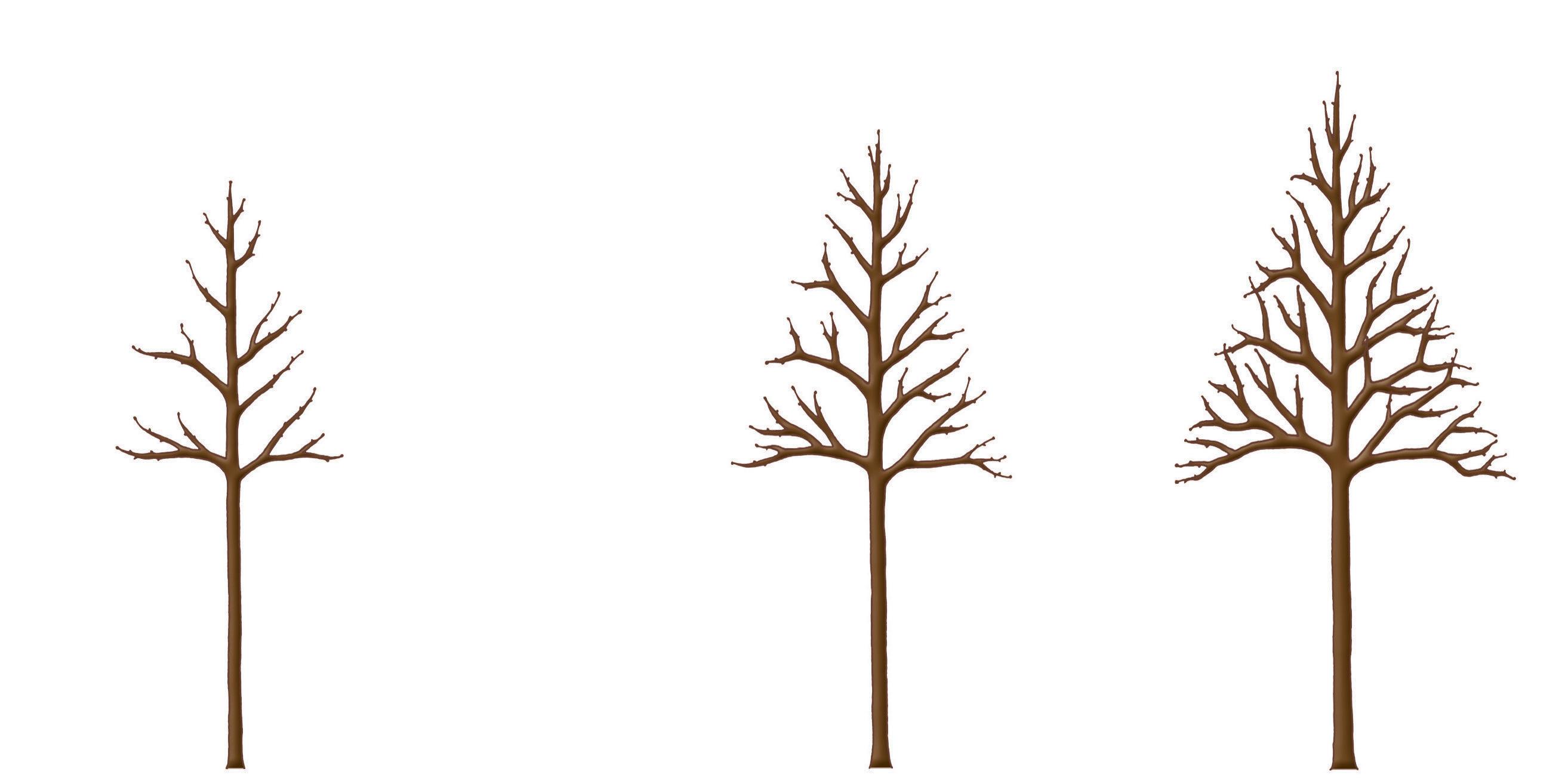 Les arbres à rameaux latéraux redressés se prêtent assez bien à cette forme. Maintenez le développement du prolongement de la tige afin que les branches latérales aient toujours environ les deux tiers de la longueur de la tige centrale. Après élévation de la couronne jusqu’à la hauteur désirée, choisissez les charpentières et taillez tout en maintenant la prééminence de la flèche centrale. Vous taillerez les branches inférieures en temps utile pour en forcer la ramification, qui devra être maintenue dans une direction redressée.