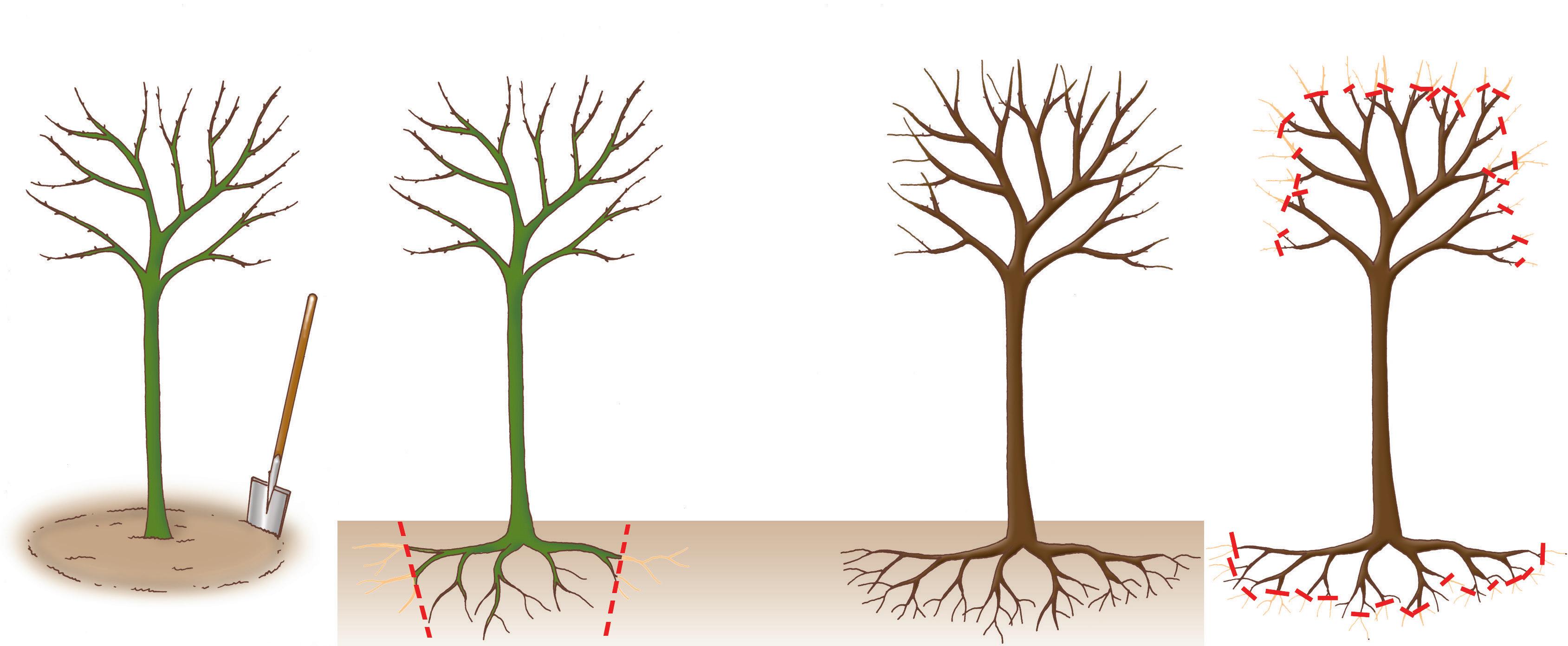 Pour assurer la reprise et un développement ultérieur normal, l’arbre a besoin qu’un équilibre soit établi entre la masse des racines et la ramure. Au moment de l’arrachage, puis de l’habillage, une partie plus ou moins importante des racines a été supprimée. Selon le diamètre des racines restantes, on peut préjuger de la longueur supprimée. Il faut procéder alors à une amputation d’égale valeur dans la ramure.