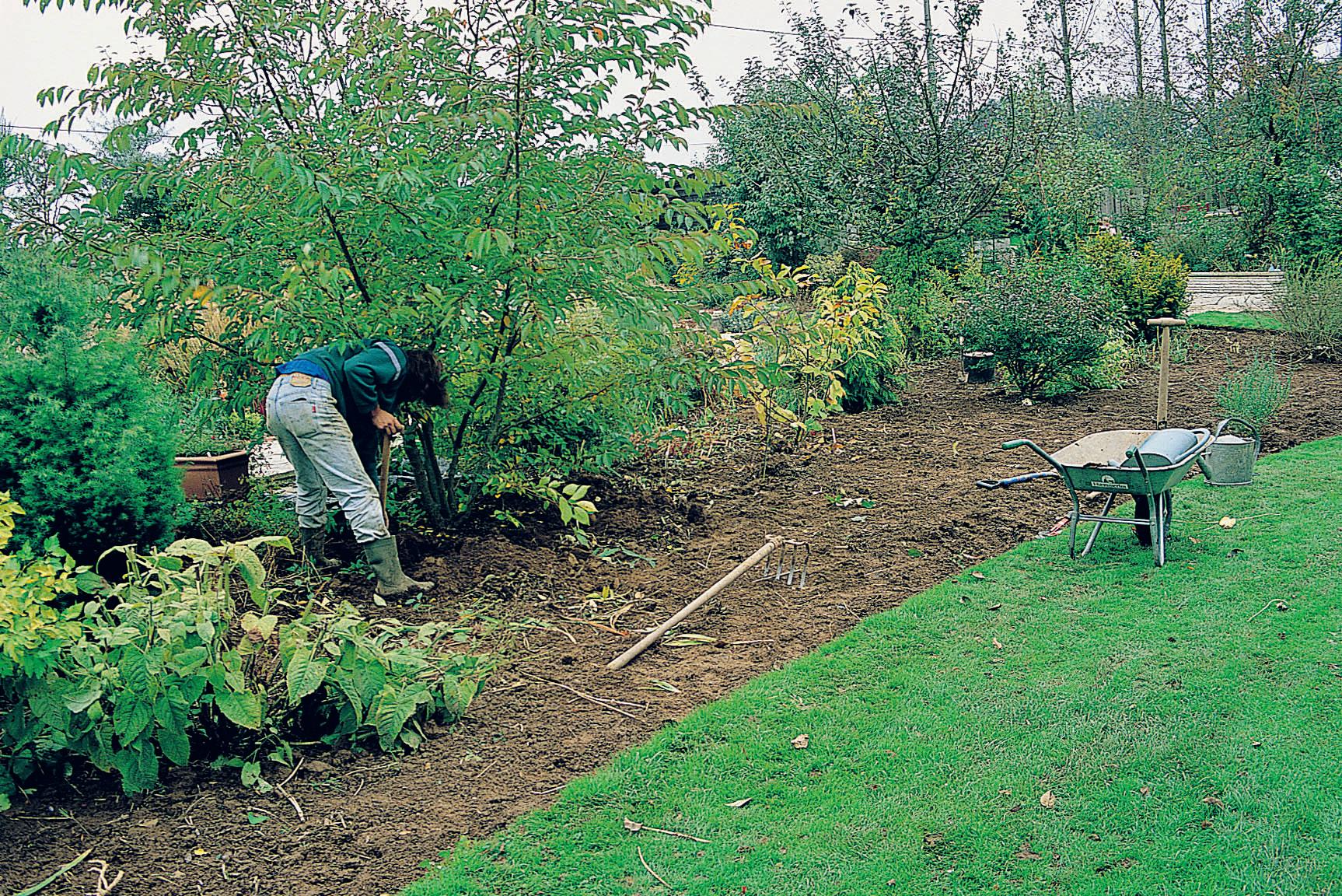 2 Les racines sont ainsi sectionnées à une longueur convenable. Tranchez-les sur une profondeur de bêche au moins et coupez si possible quelques racines sous la motte.
