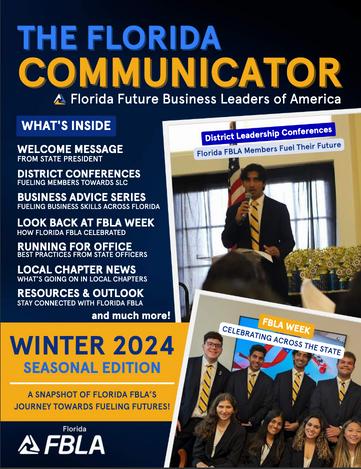 We began the year with a reimagined vision of what it means for Florida to go to NLC: The Florida FBLA Pre-NLC Communicator. This edition was the launch of the new design for The Communicator as well as a move to featuring the resources that helped Fuel the Future of Our Members. The Fall Communicator saw the launch of the Article Submission Program and highlighting of all the amazing things going on in both the state chapter and our local chapters, and the debut of the Florida FBLA Resource Center. The Winter Communicator continued the new formula for the Communicator with a focus on the Winter Activities of our local chapters. Finally, we have this innovative SLC Edition. For the first time ever, we have a Florida Communicator geared to the State Leadership Conference.