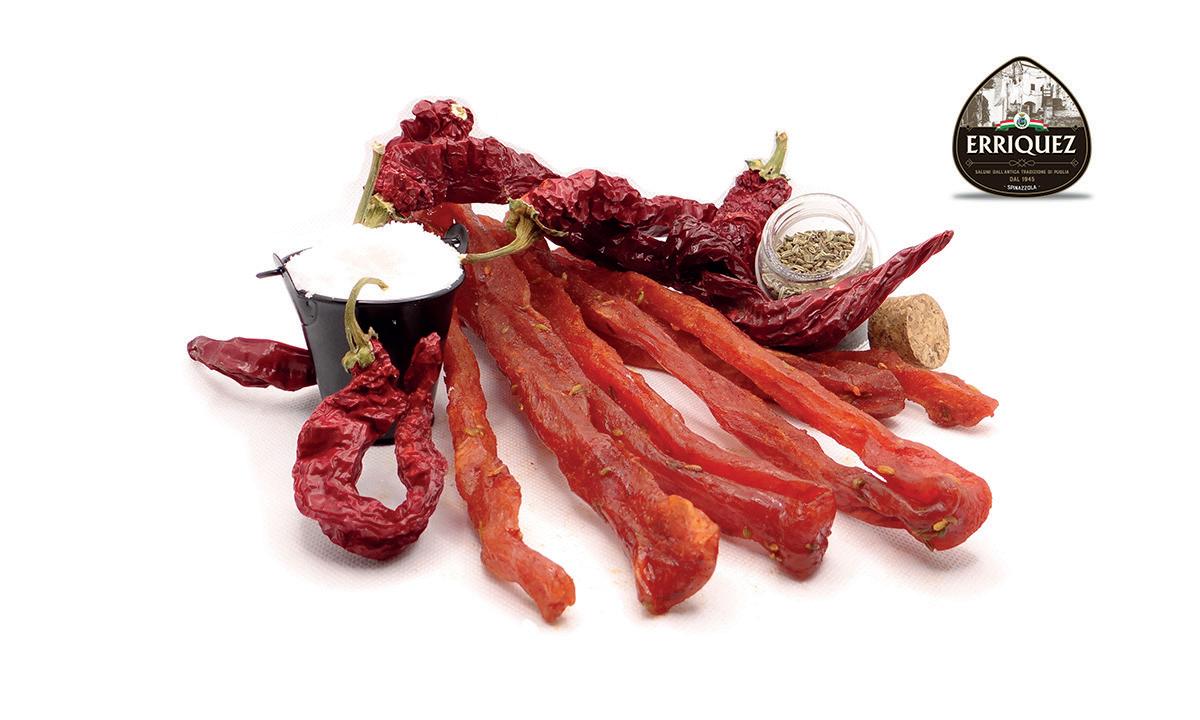 Sono striscette di suino, tagliate a mano, aromatizzate con pepone dolce e seme di finocchio della Murgia.