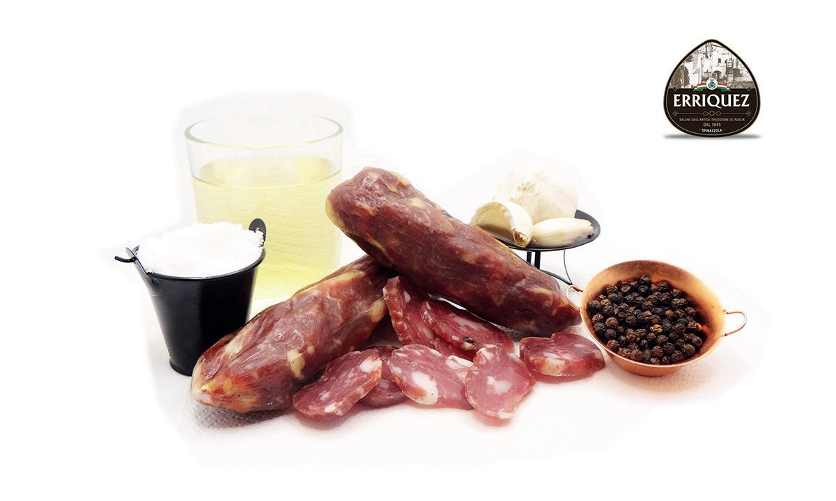 carne di suino origine ITALIA, sale, peperone dolce, seme di finocchio selvatico dell'Alta Murgia.