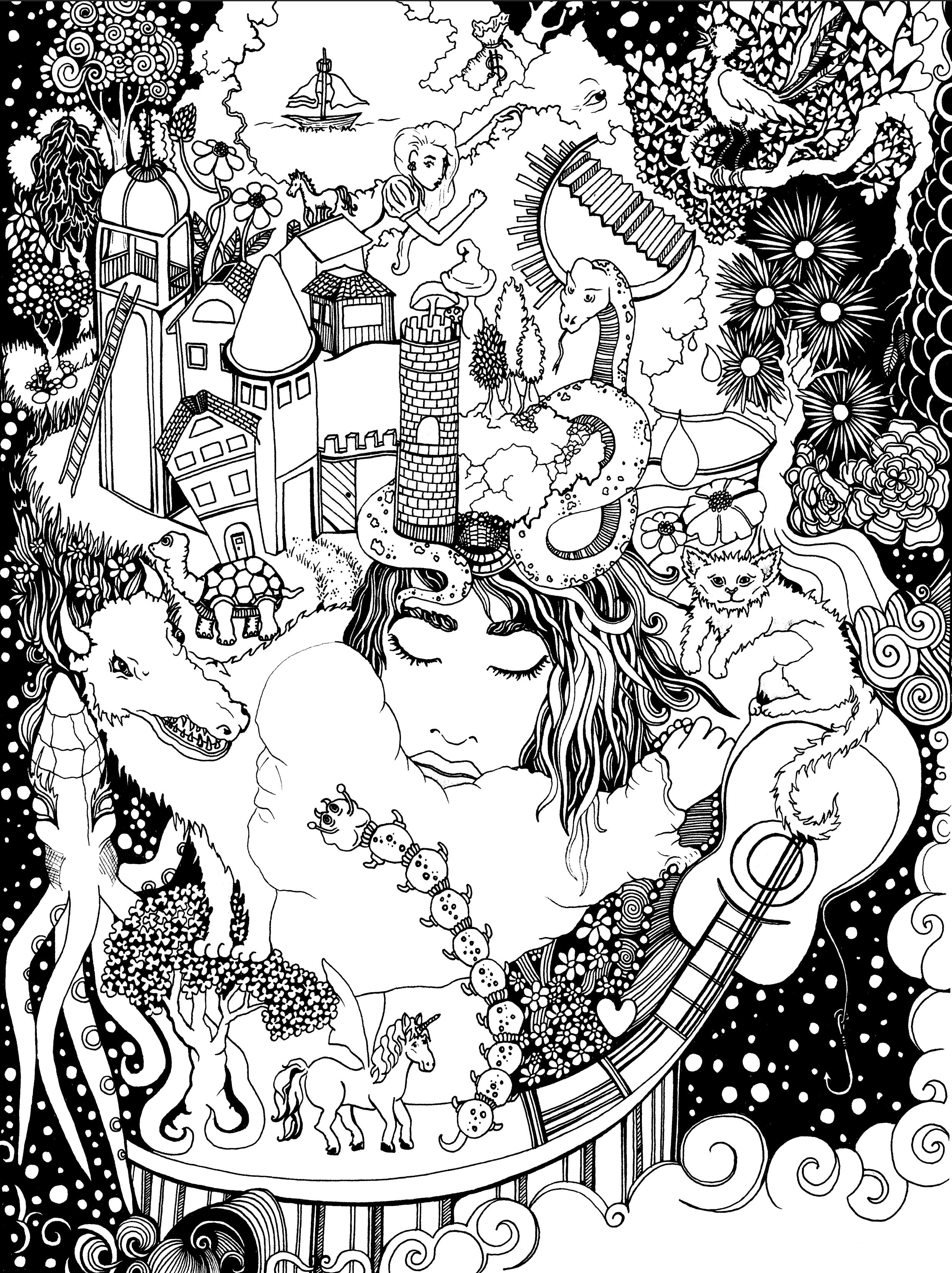 Julia’s love for imagination, fantasy and nature inspired her to create this dream filled, coloring art book, in all their shapes and details. The illustrations in this book are sharpie free-hand drawings.