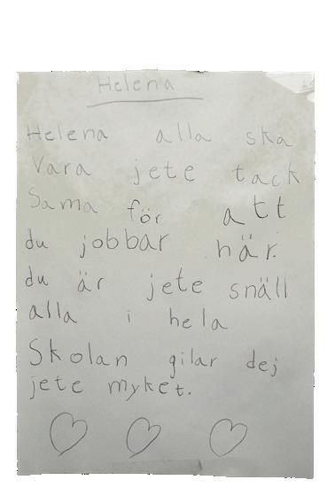 Barnen är härliga och de ger verkligen en extra krydda till vardagen. Ibland kommer de och vill ha hjälp med till exempel dragkedjor och vantar och jag hjälper gärna till. Ofta tackar de mig för att jag har städat deras skola och då och då får jag små lappar med uppmuntran, för det mesta av småtjejerna. Det kan till exempel stå att de är tacksamma för att jag jobbar på skolan och att jag är jättesnäll. Jag blir alltid lika glad av att få så fina tack av barnen! Det sätter guldkant på arbetet.