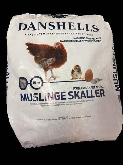 Knuste muslingskaller med 38% kalsiuminnhold. Brukes som miljøberikelse og ekstra kalsiumtilskudd til eggleggende fjørfe. Positiv for å opprettholde god skallkvalitet. Bidrar til naturlig atferd i flokken. Bør gis på ettermiddagen slik at kalsium er tilgjengelig når eggeskallet dannes. Leveres i 15 kg sekk.