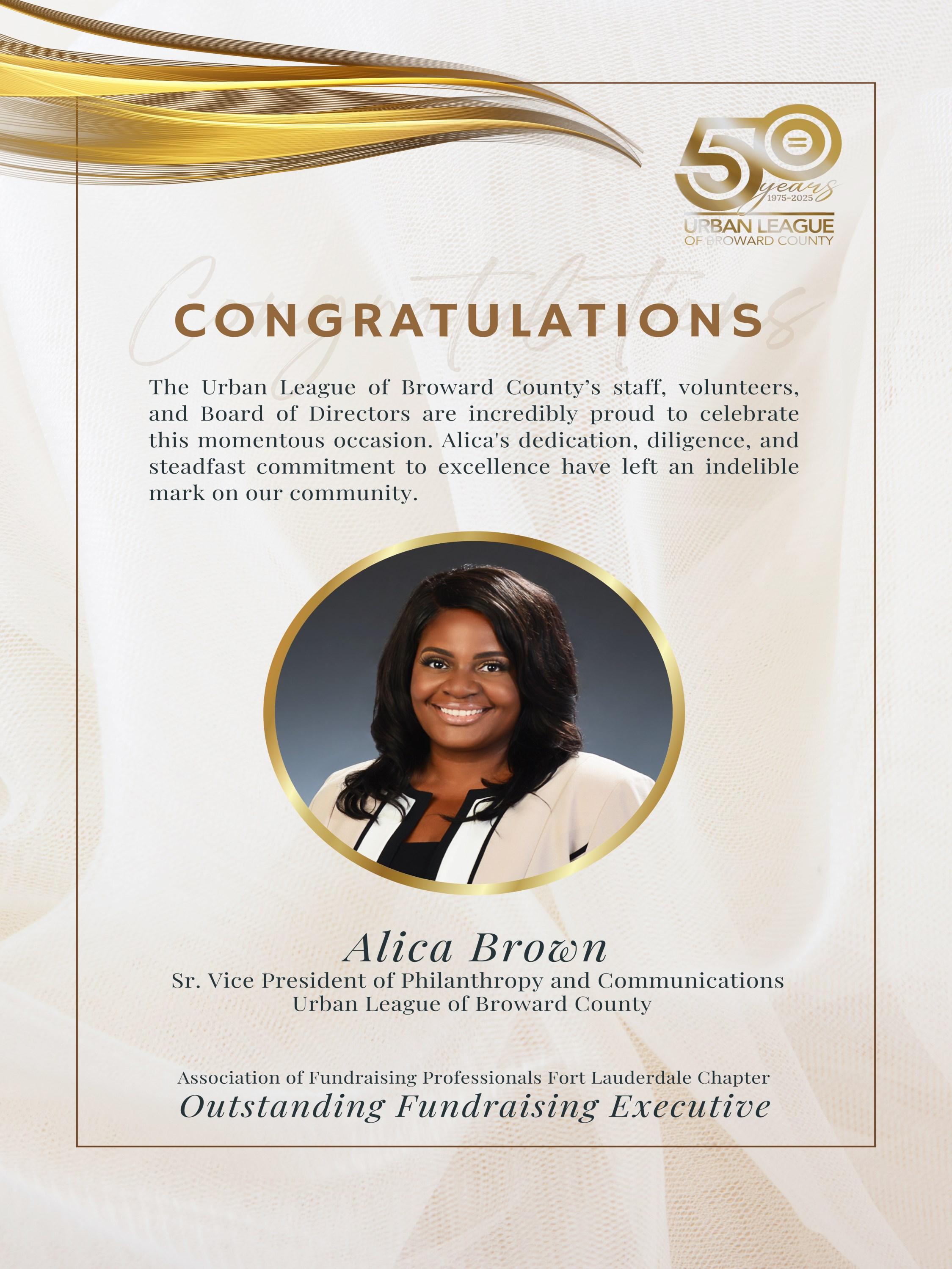 Beyond her professional role, Alica is an active member of the AFP and is deeply invested in advancing philanthropy within Black and Brown communities. As part of the Greater Broward County Chapter of The Links, Incorporated, she collaborates with leaders to deliver educational and cultural enrichment programs.