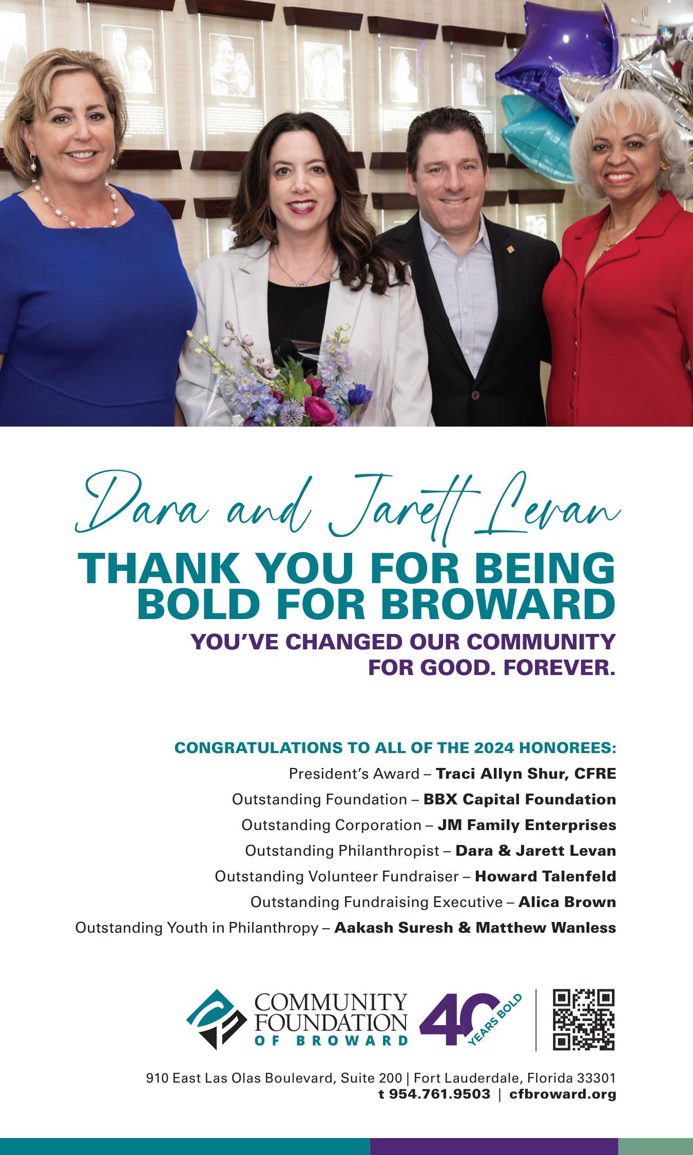 Dara and Jarett Levan are exemplary philanthropists, dedicated to enhancing Broward County through significant personal and corporate contributions. Their leadership and generosity foster love, empathy, and life changing impact for the community they call home. Since founding their first endowment at the Community Foundation of Broward, they have donated over $1 million to support the arts and mental health services. Their Dara and Jarett Levan Fund for the Arts fosters creativity and provides lasting support to local artists, while the Levan Fund for Mental Health and Well-Being addresses critical mental health needs, providing sustainable support for counseling and other services.