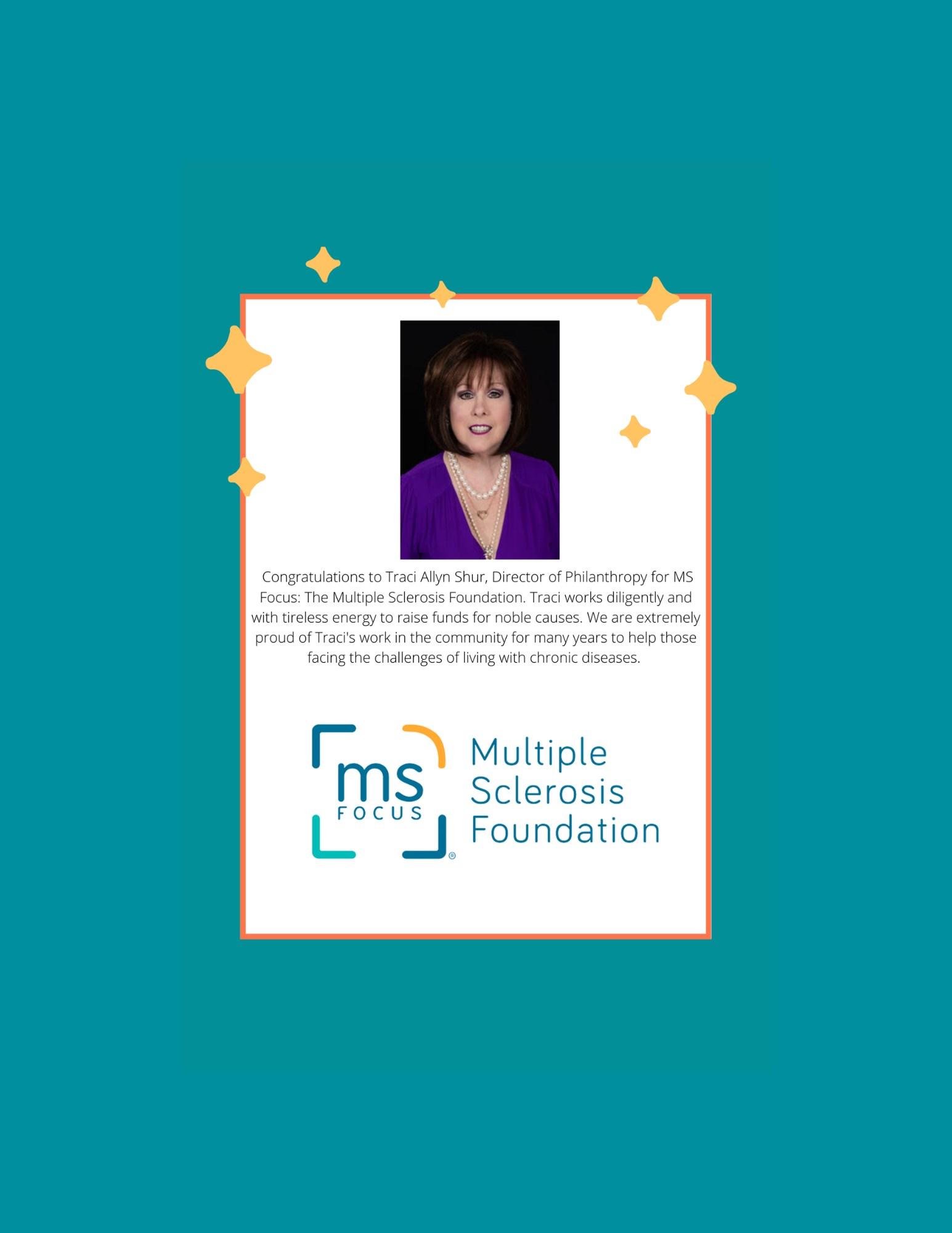 The Multiple Sclerosis Foundation is honored to celebrate Traci Allyn Shur, our exceptional Director of Philanthropy, as she receives the prestigious Presidential Award. Traci embodies integrity, compassion, and empathy in her work, consistently going above and beyond to support the MS community. Through her leadership, she has spearheaded numerous initiatives to secure vital funds, expand resources, and provide hope for those affected by multiple sclerosis. Her dedication and ability to inspire others have created meaningful impacts, not only within our organization but throughout the larger community. Today, we proudly celebrate Traci's commitment to making a difference.