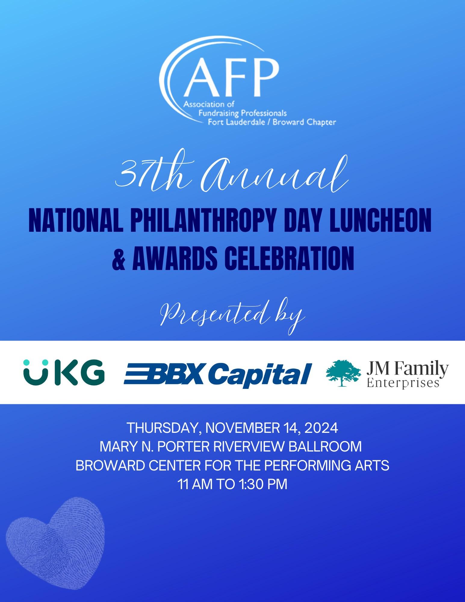 Welcome to the 37th Annual National Philanthropy Day & Awards Celebration benefiting the Association of Fundraising Professionals Fort Lauderdale/Broward Chapter! We thank you for your support as we gather to honor and celebrate outstanding philanthropic leaders, who have invested their passion, time, talents, and financial support to better our community.