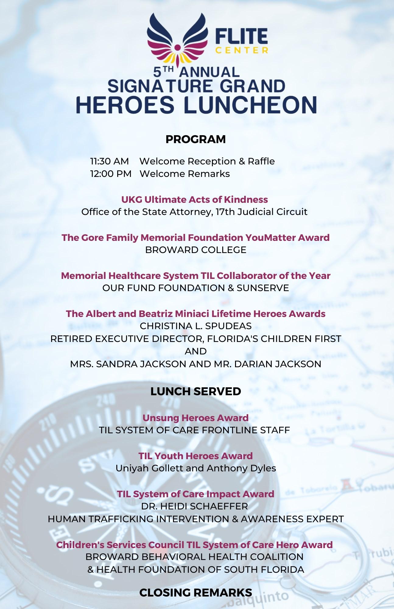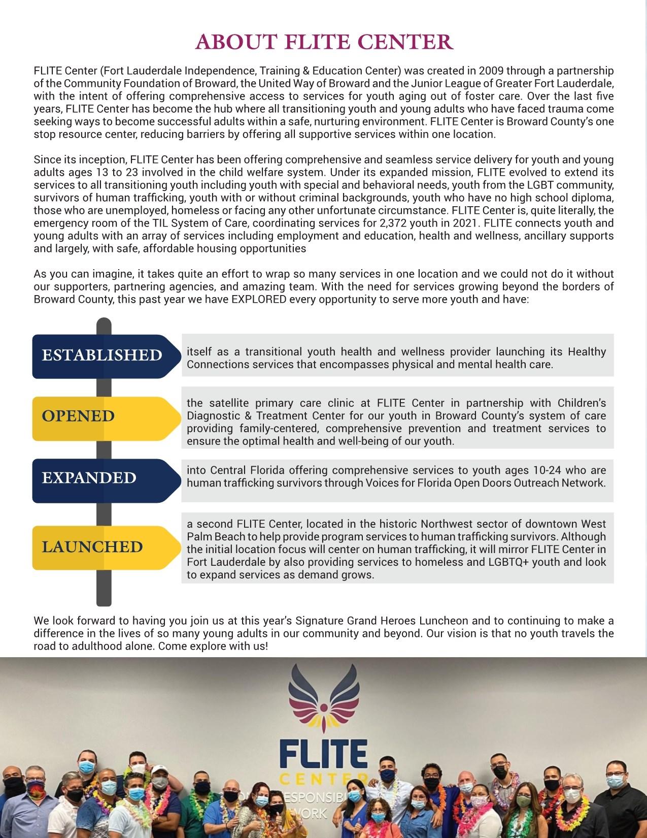 Dear Friends, Welcome to all partners, contributors, employees, board members and frontline staff to the 5th Annual FLITE Center Signature Grand “Explore The Future” Heroes Luncheon, recognizing the unsung heroes in our community who champion young people. Today, we honor our community partners and frontline staff from collaborating organizations who support and dedicate their lives to impacting youth in Broward County’s Transitional Independent Living (TIL) System of Care.