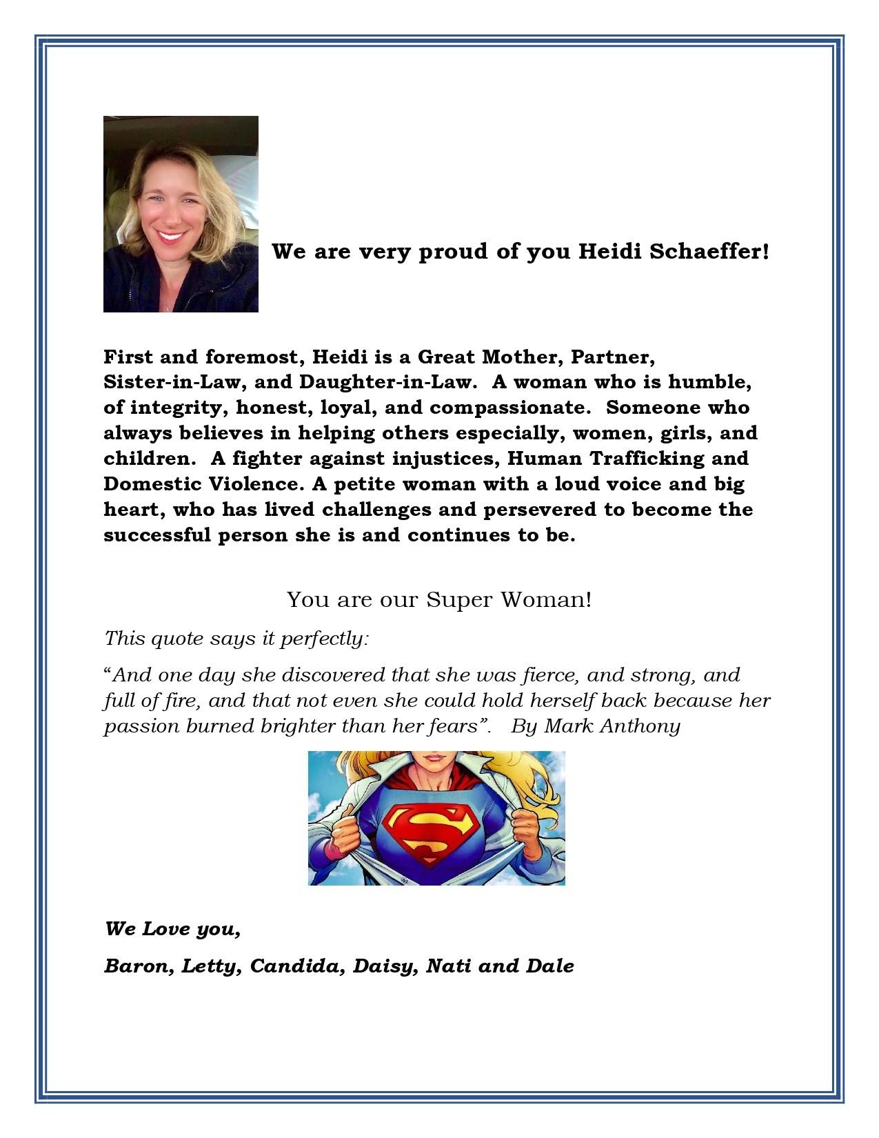 Dr. Schaeffer closely collaborates with several Human Trafficking Task Forces and has served on the executive boards of many coalitions, including as President of the Human Trafficking Coalition of the Palm Beaches. She is an Advisory Board member at Place of Hope and the District 1 Director-Emeritus of Soroptimist International of the Americas’ Southern Region.