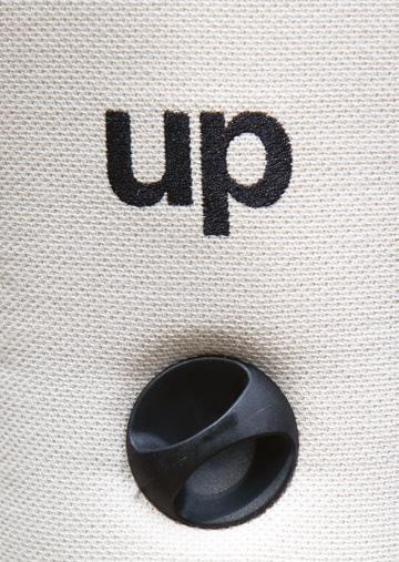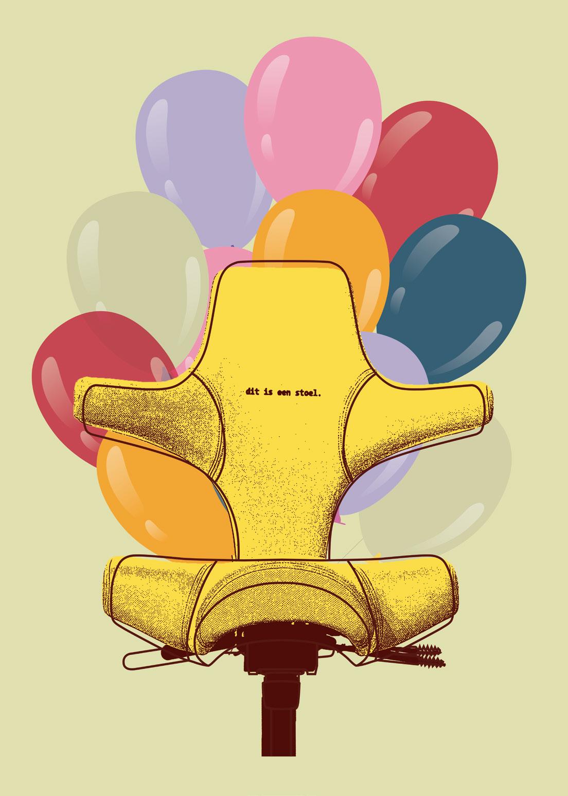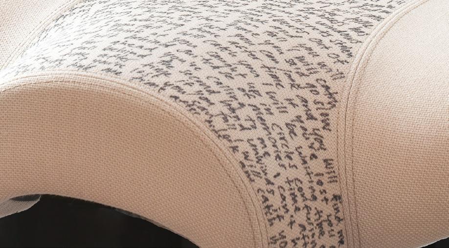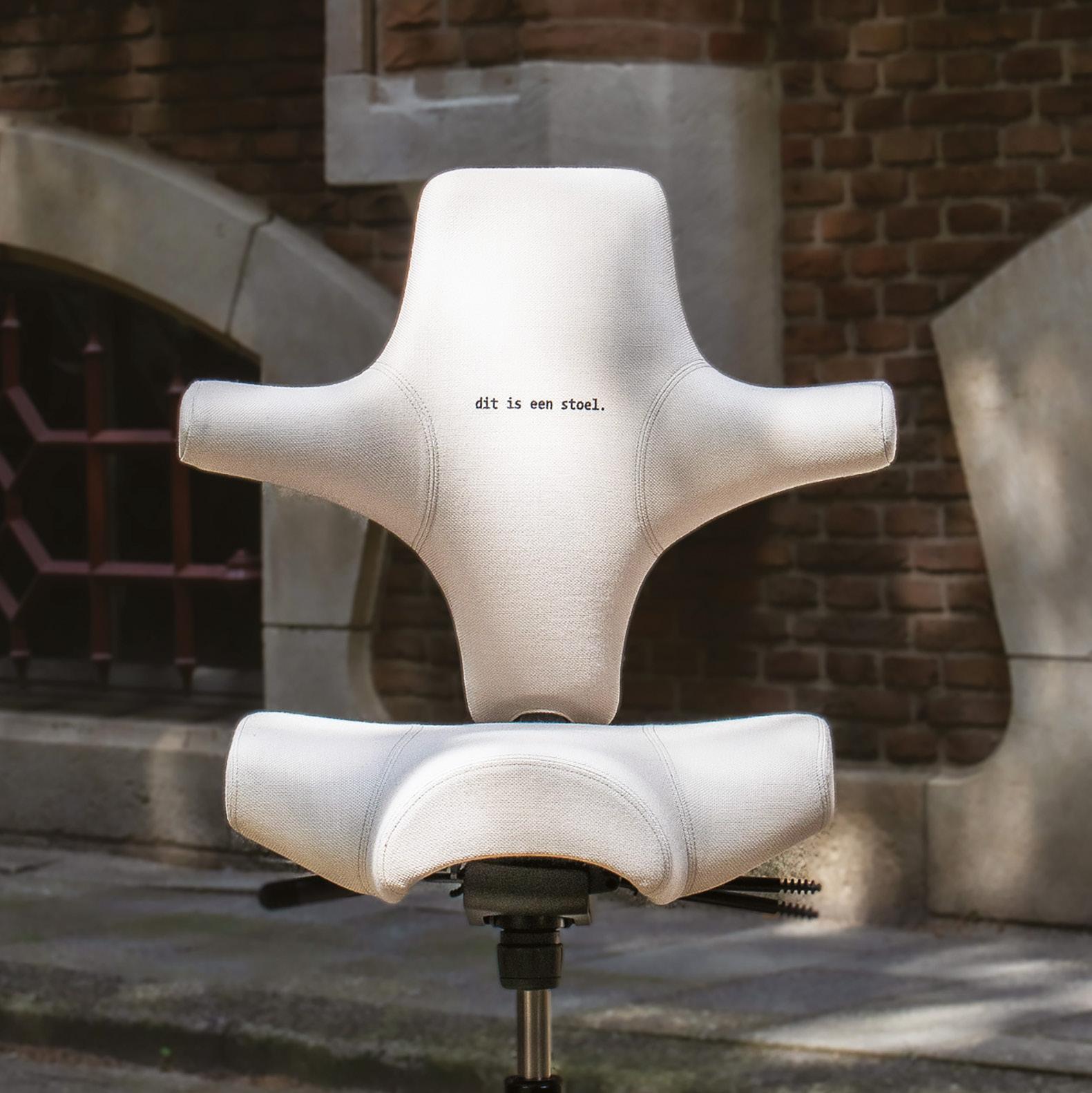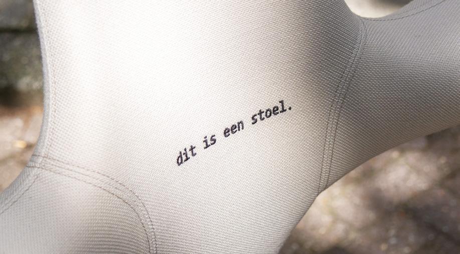 Neutral, monochromatic upholstery allows the chair’s silhouette to stand on its own, uninterrupted and uncompromised. The embroidered phrase “dit is een stoel” (Dutch for “this is a chair”) serves as both a literal label and a conceptual reference. Inspired by René Magritte’s surrealist commentary, it challenges perception while affirming function. On the backrest, the word “up” adds a second layer, referring either to movement, or to the name of the collaborating studio.
