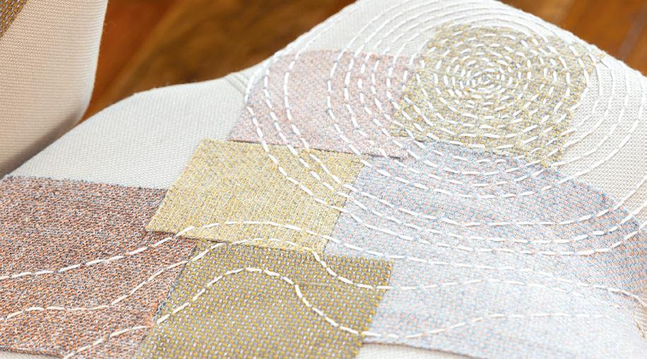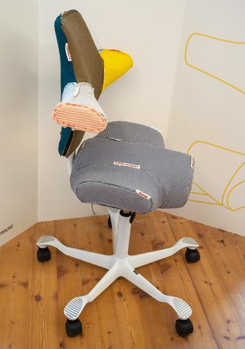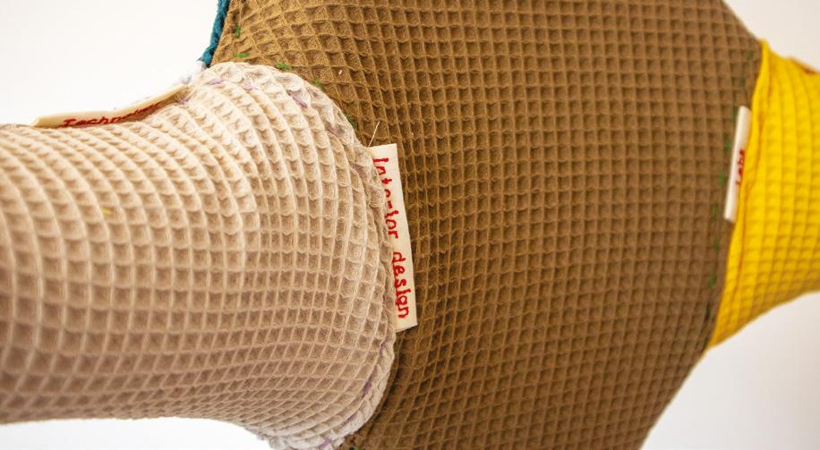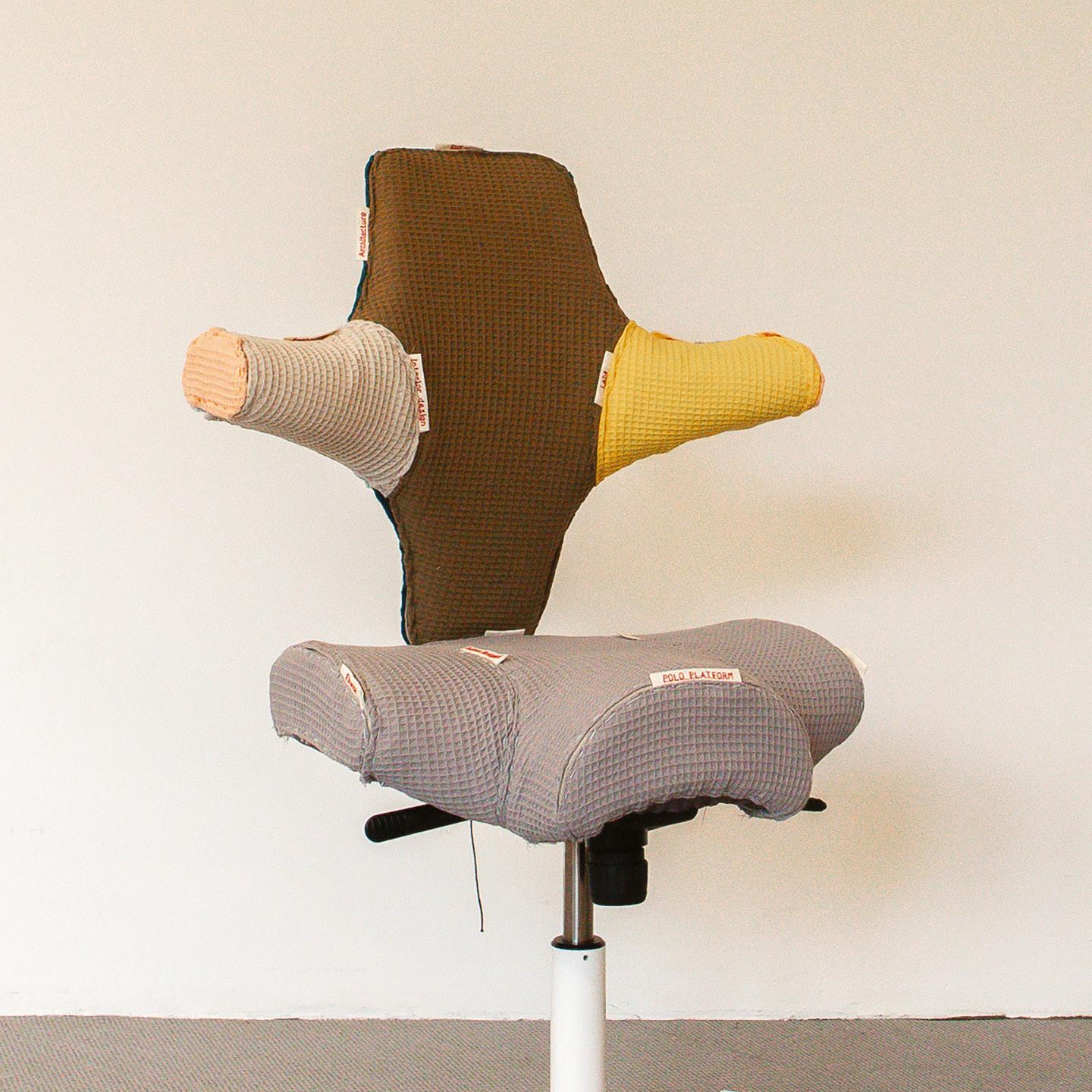 The chair is clad in soft, waffletextured fabrics in multiple colours. The patchwork upholstery visually separates and celebrates different creative disciplines, with each fabric section symbolising architecture, urbanism, or interior design. Exposed seams and visible labels such as “business development” and “interior design” reinforce a sense of openness and collaboration.