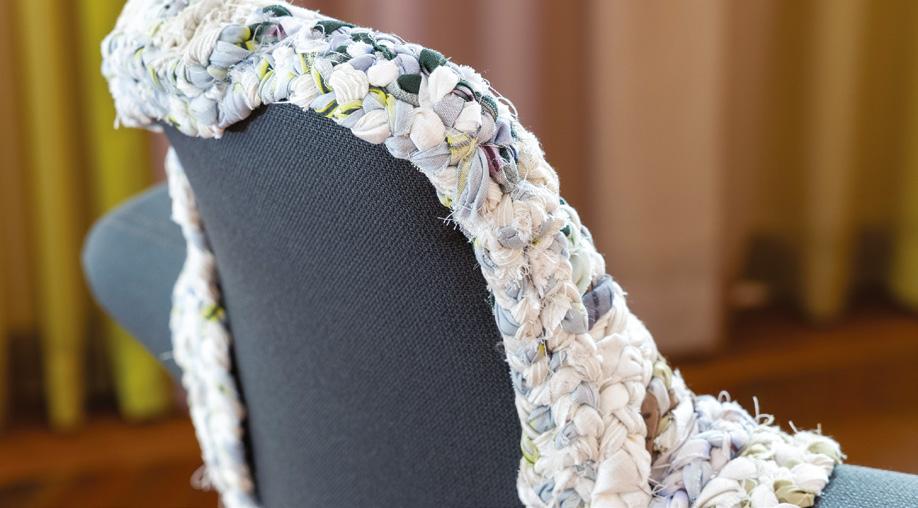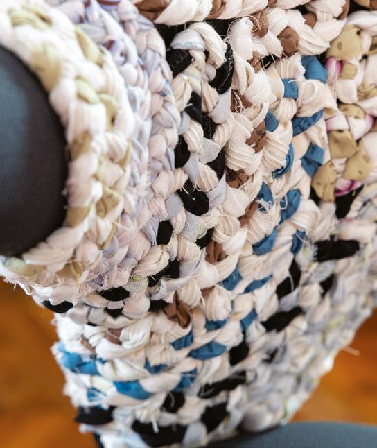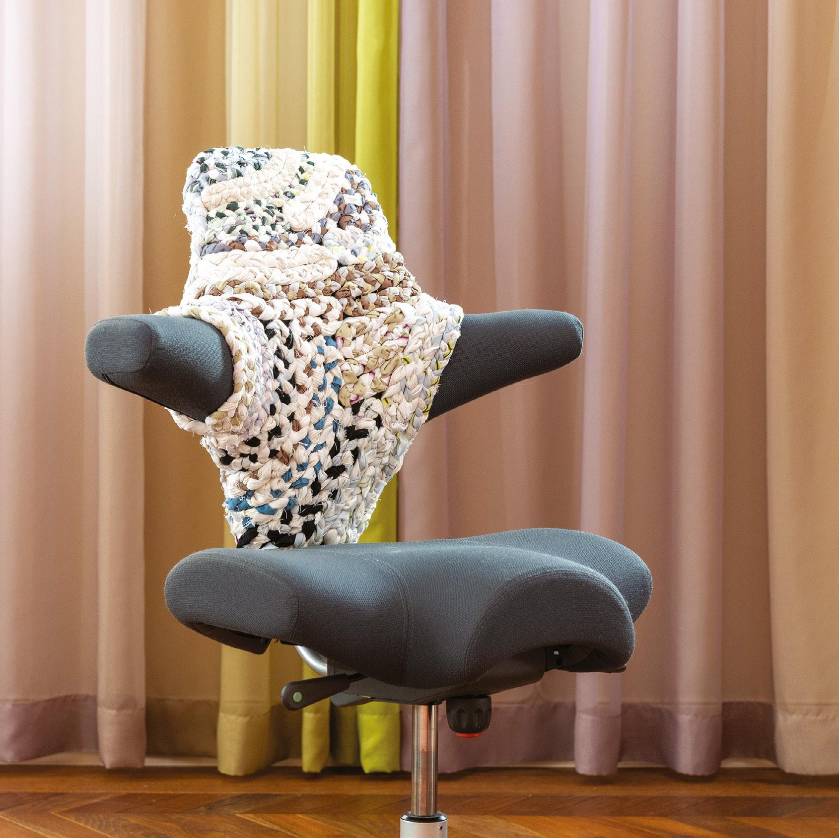 Braided strips of recycled fabric were used to create a handwoven textile piece, which envelops the upper half of the chair like a soft, protective shell. The contrast between the chair’s sleek ergonomic form and the textured, homespun cover creates a powerful dialogue between modern design and nostalgic craftsmanship.