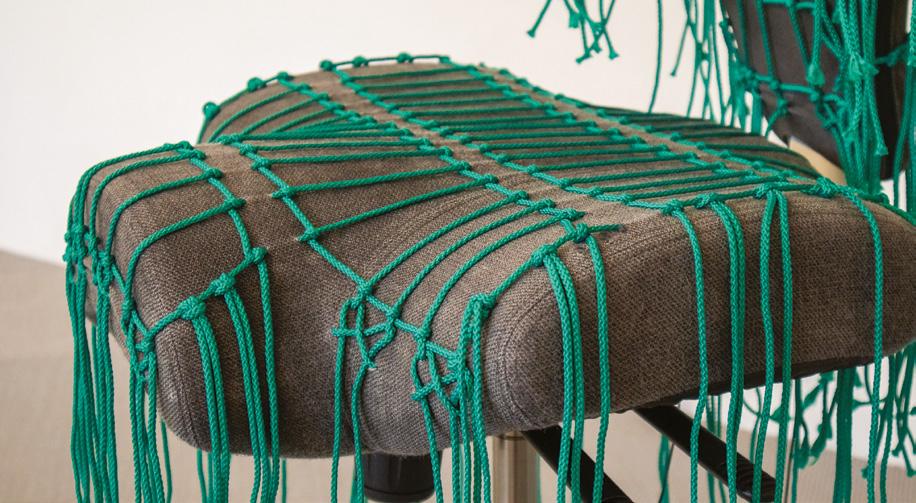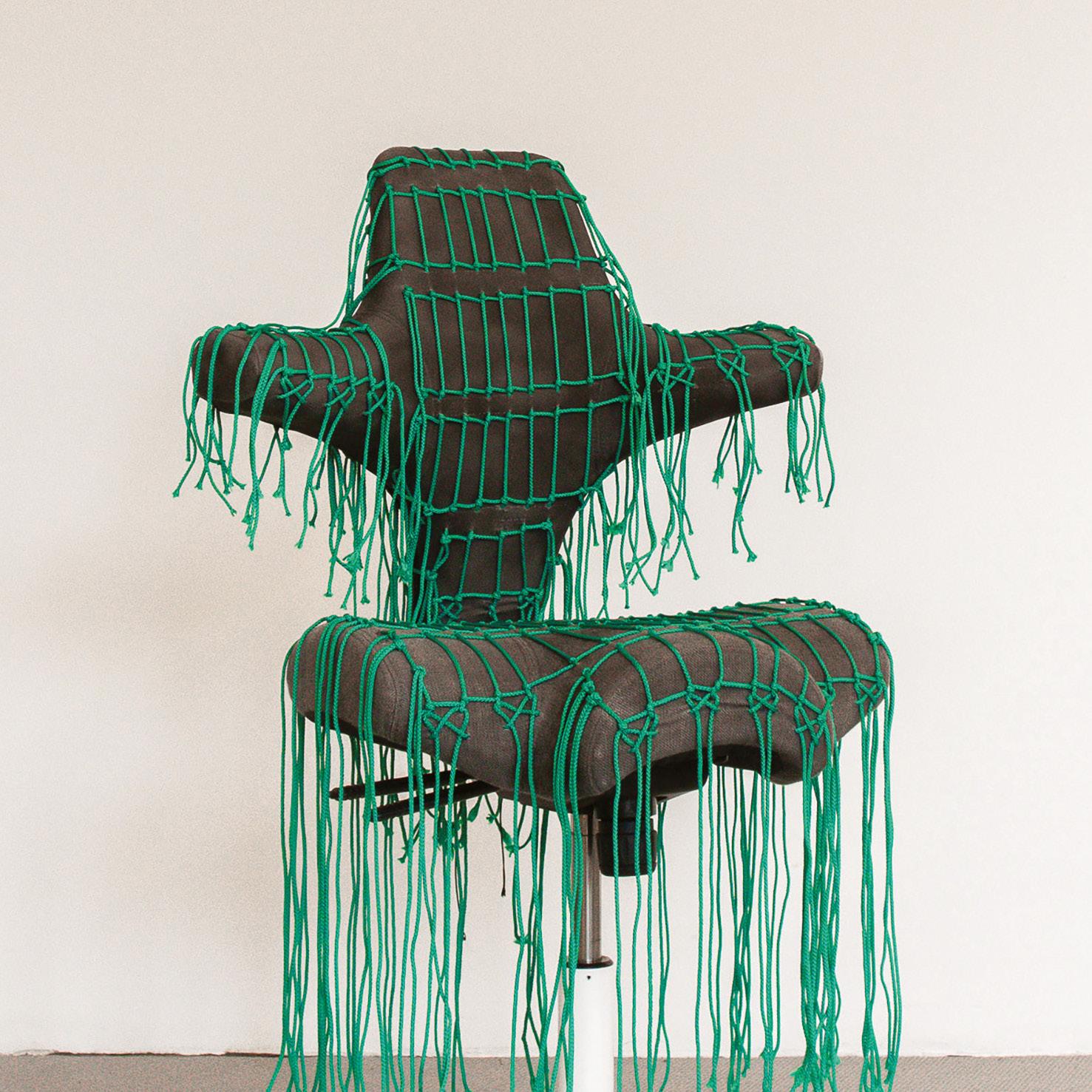 Over 100 metres of vibrant teal rope are hand-woven into a precise grid that wraps around the seat and backrest. The pattern contrasts sharply with the dark fabric beneath, while the free-hanging fringe adds movement and softness.