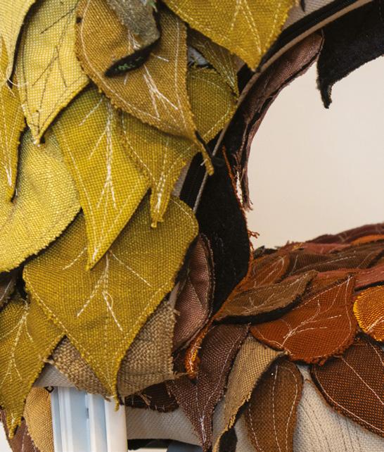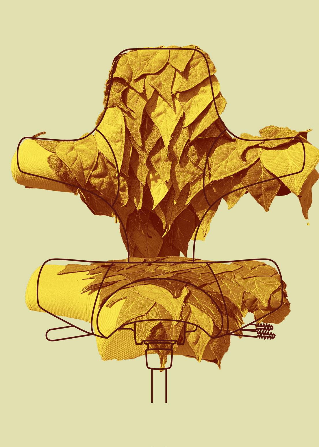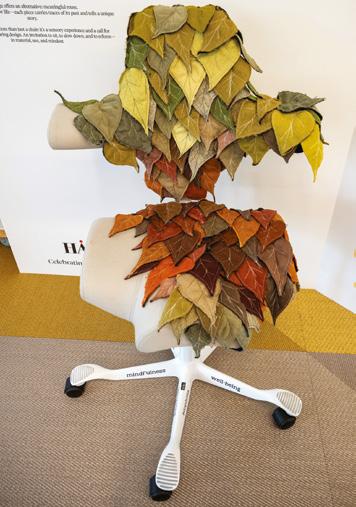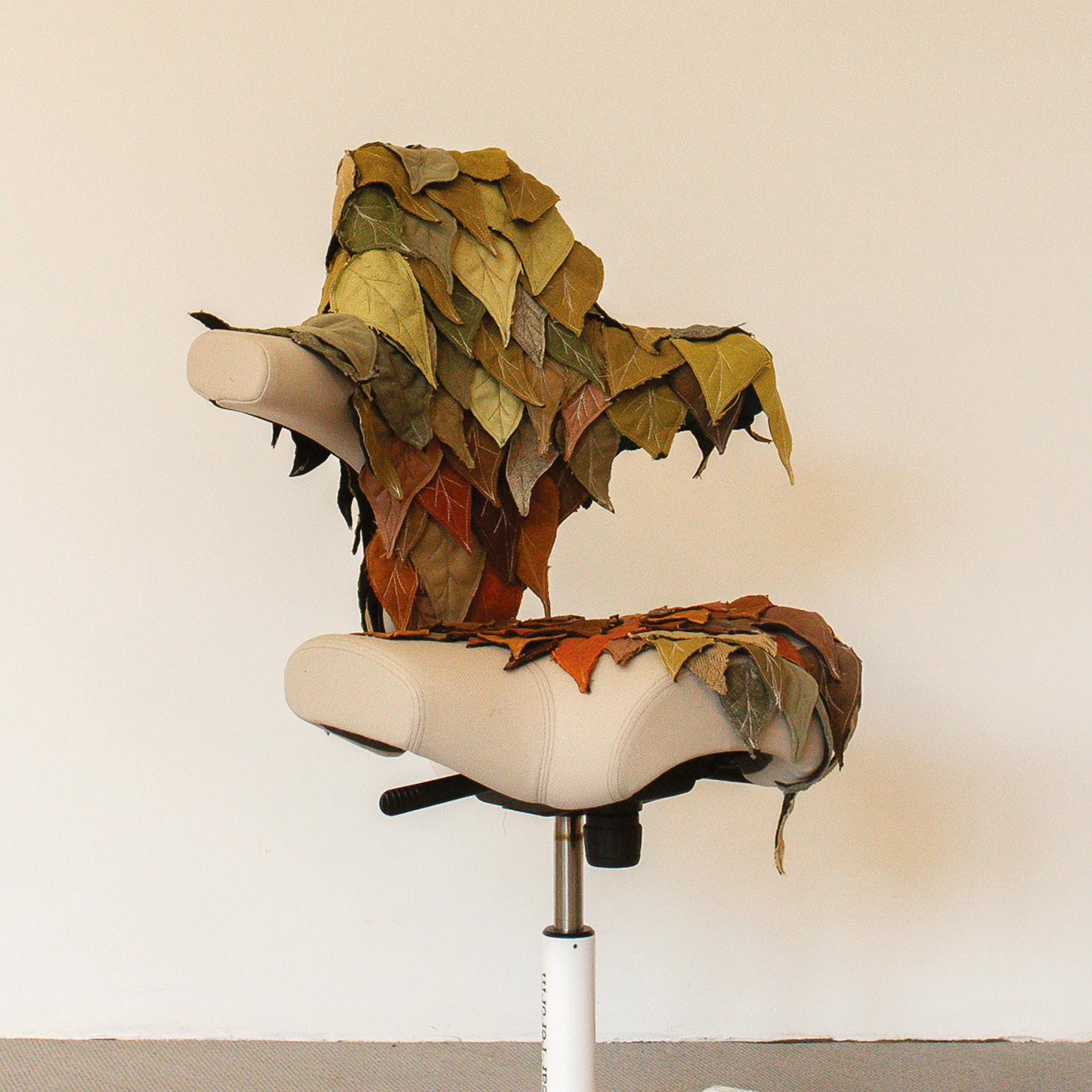 Hand-cut, leaf-shaped fabric elements are stitched across the seat and backrest, crafted from repurposed upholstery swatches. The palette shifts from moss green to golden ochre, rust red, and warm brown, evoking autumn foliage. Words like “mindfulness,” “biophilia,” and “well-being” are inscribed on the base, reinforcing the message.