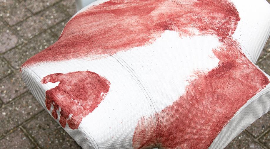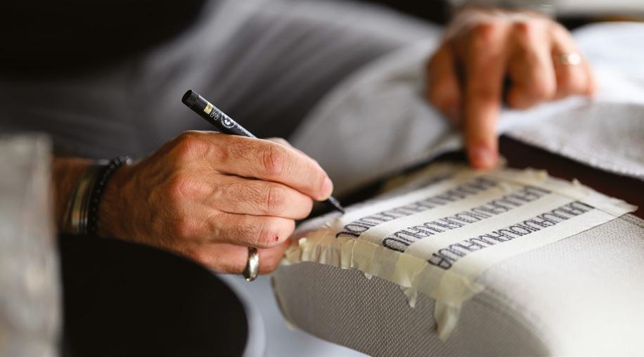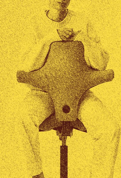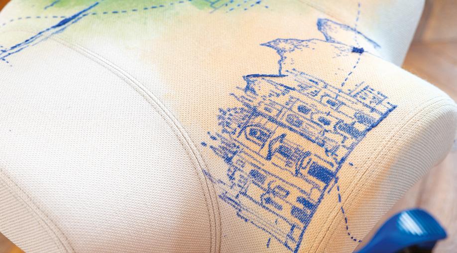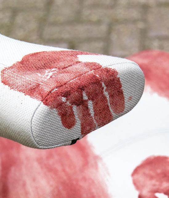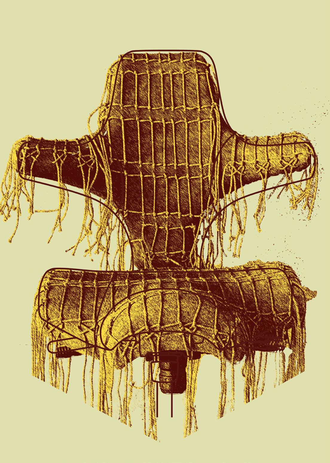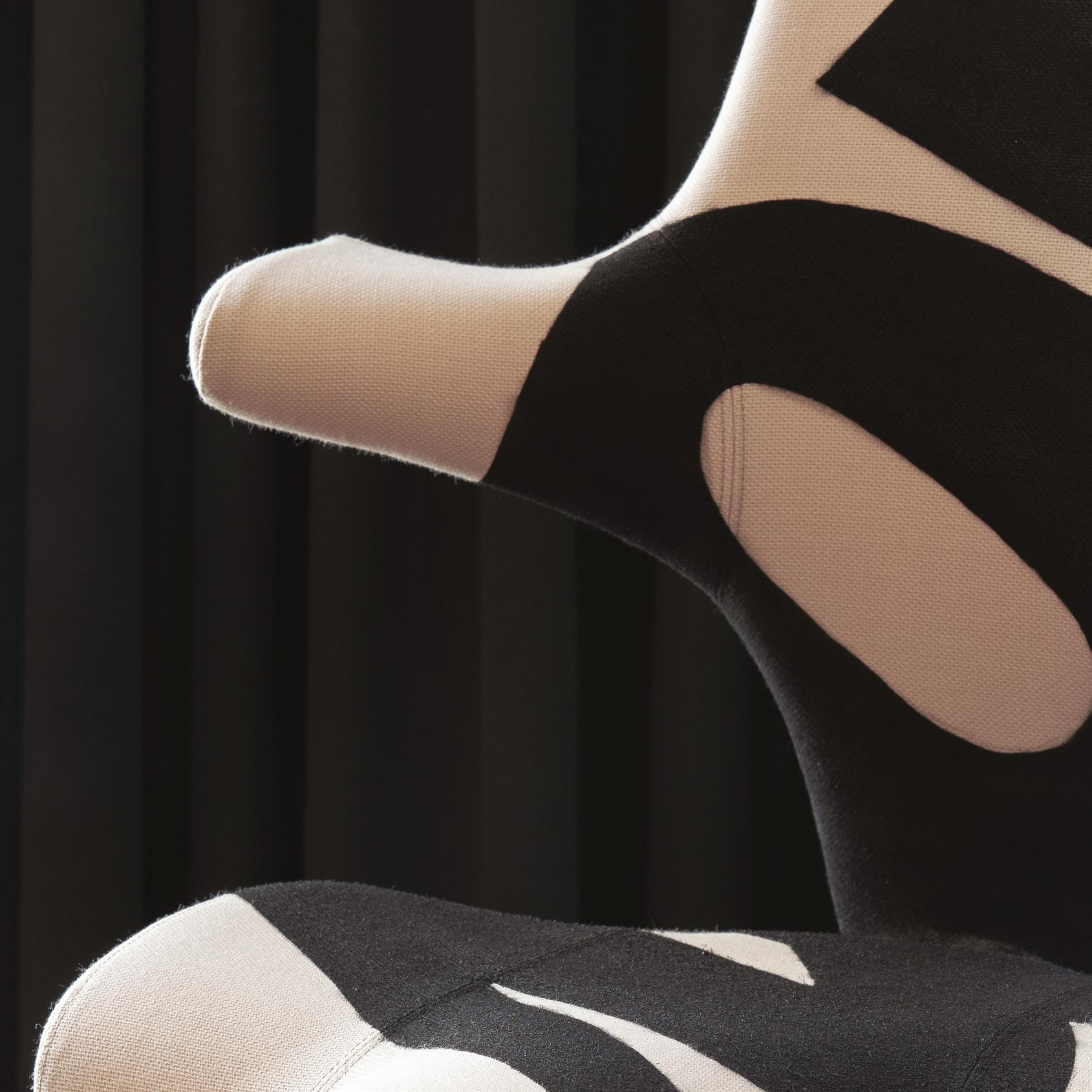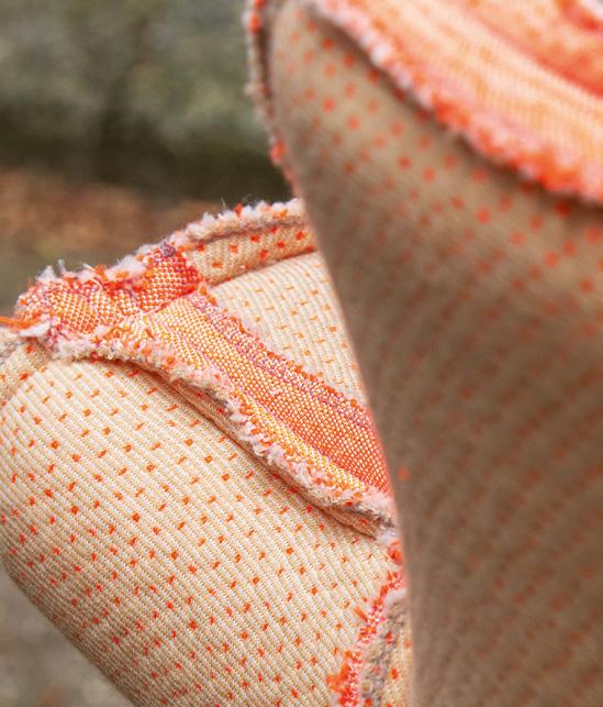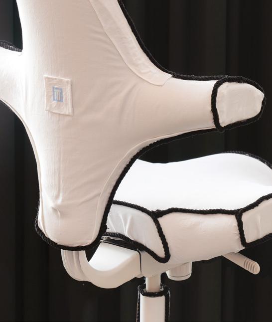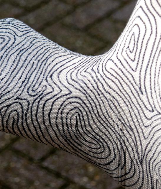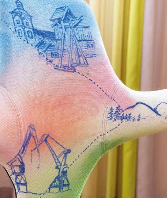 With its sharp colour contrast, textured materials, and a blend of analog techniques and digitallooking forms, the chair becomes more than a seat. It invites reflection on heritage, time, and transformation.