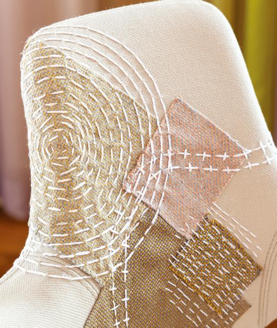 Patches of fabric have been sewn onto the chair, with visible stitching added in various places. These deliberate interventions highlight areas that appear worn or broken, turning signs of damage into thoughtful repairs.