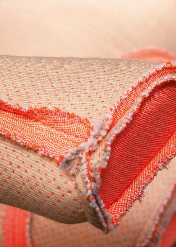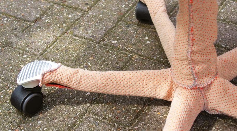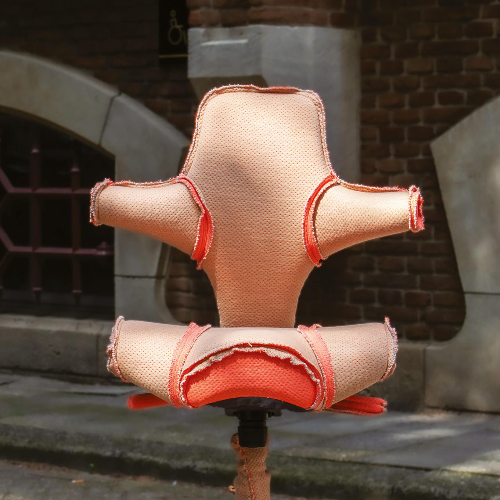 Featuring powder-pink upholstery, loosely fitted fabric, and exposed seams with frayed edges, the chair breaks from traditional workplace aesthetics. It avoids rigid structure in favour of soft, organic forms and a patchworklike expression.