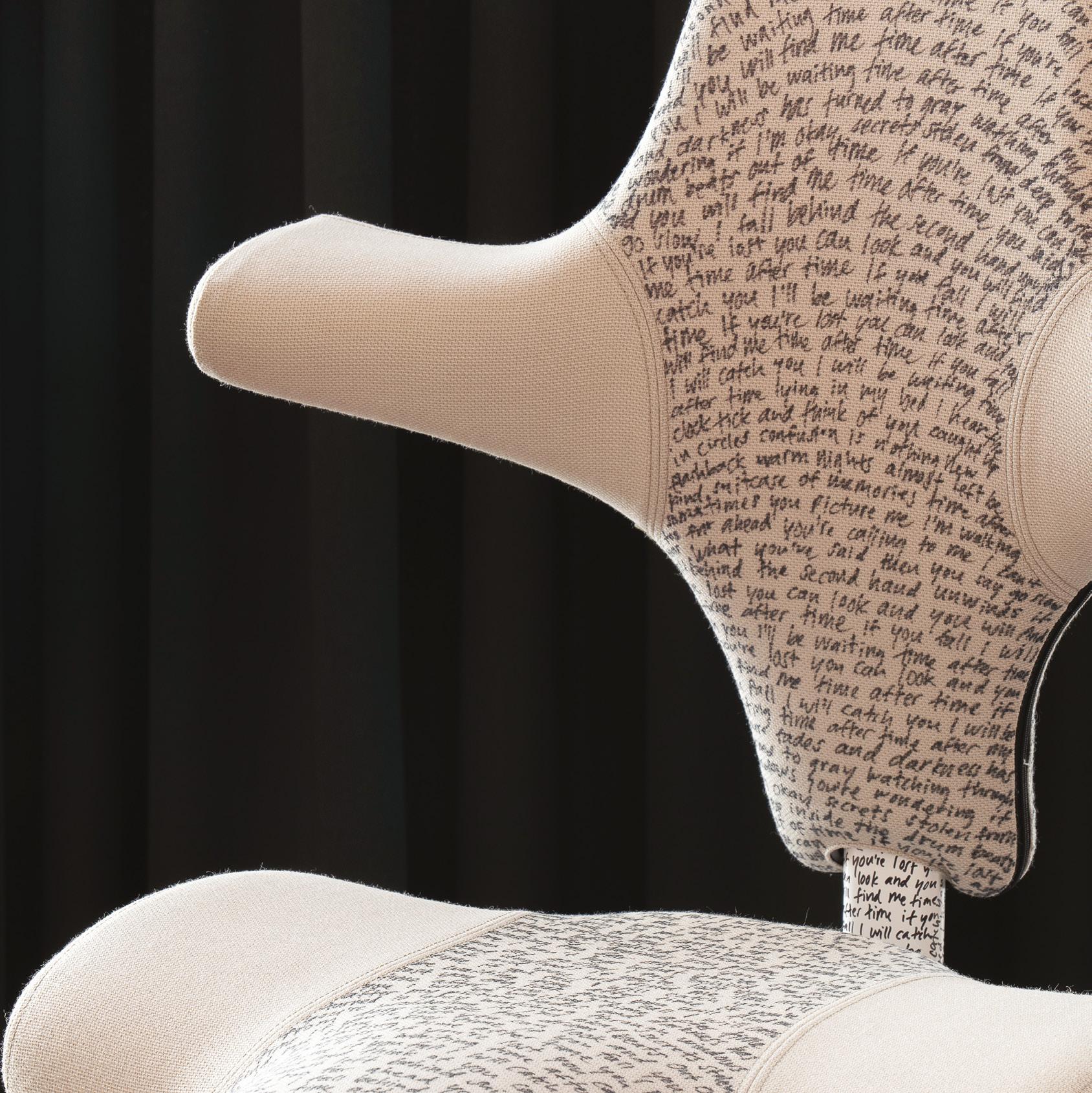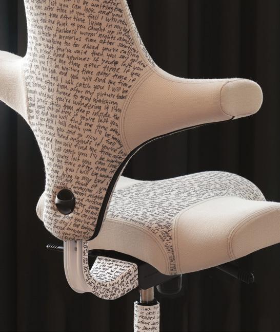 The studio kept the modification simple and deliberate. Using a fabric pen, they hand-wrote the full lyrics of the song directly onto the chair’s upholstery, wrapping the text carefully across its surface. The line “If you fall, I will catch you, I’ll be waiting, time after time” is especially meaningful, echoing both the physical support of a well-designed chair and the lasting durability of the Capisco itself.