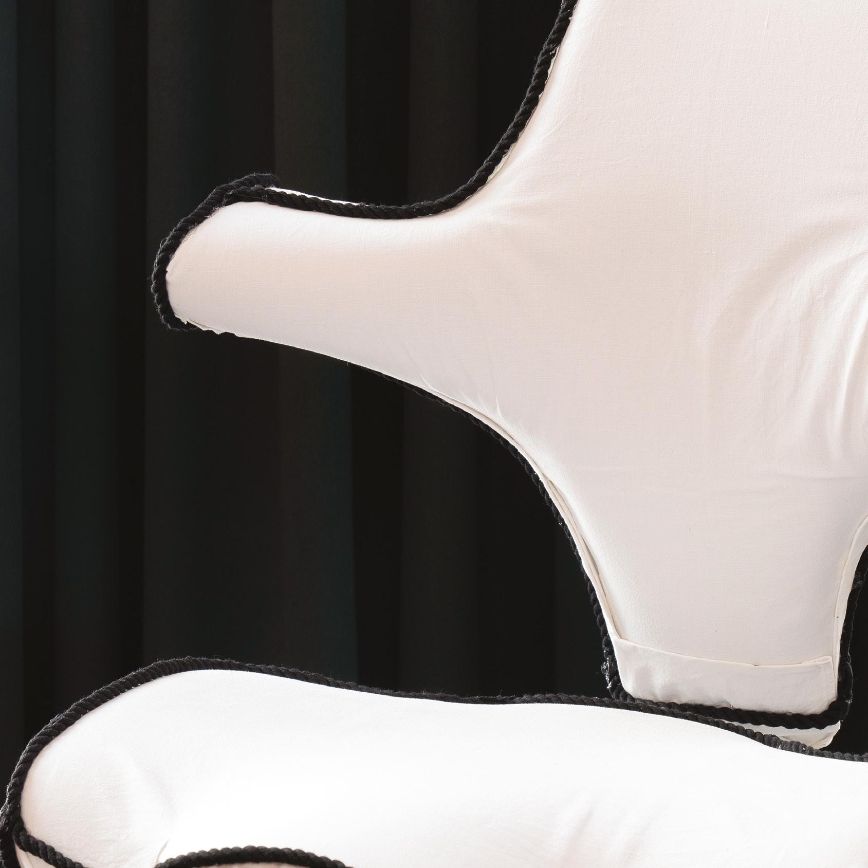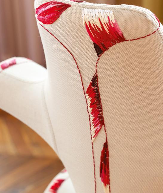 Striking red embroidery is placed with deliberate asymmetry across the backrest, seat, and edges. The vivid threadwork evokes organic forms and adds bursts of colour and energy to the chair’s elegant silhouette. These stitched accents enhance the flowing shape without interrupting functionality.