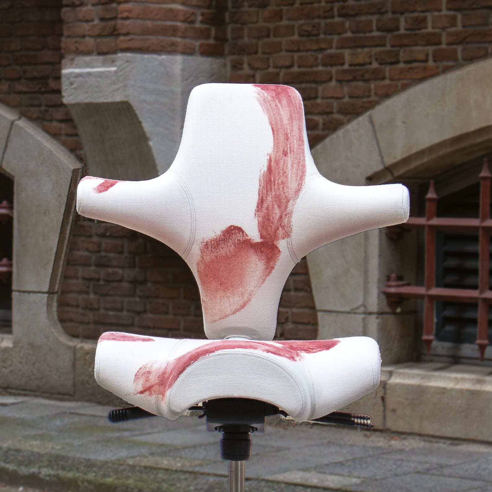 Forty hand-embroidered muscles are stitched across the chair, one for each muscle engaged when sitting dynamically. The concept celebrates active sitting and highlights the Capisco’s design legacy through anatomical reference and movement.