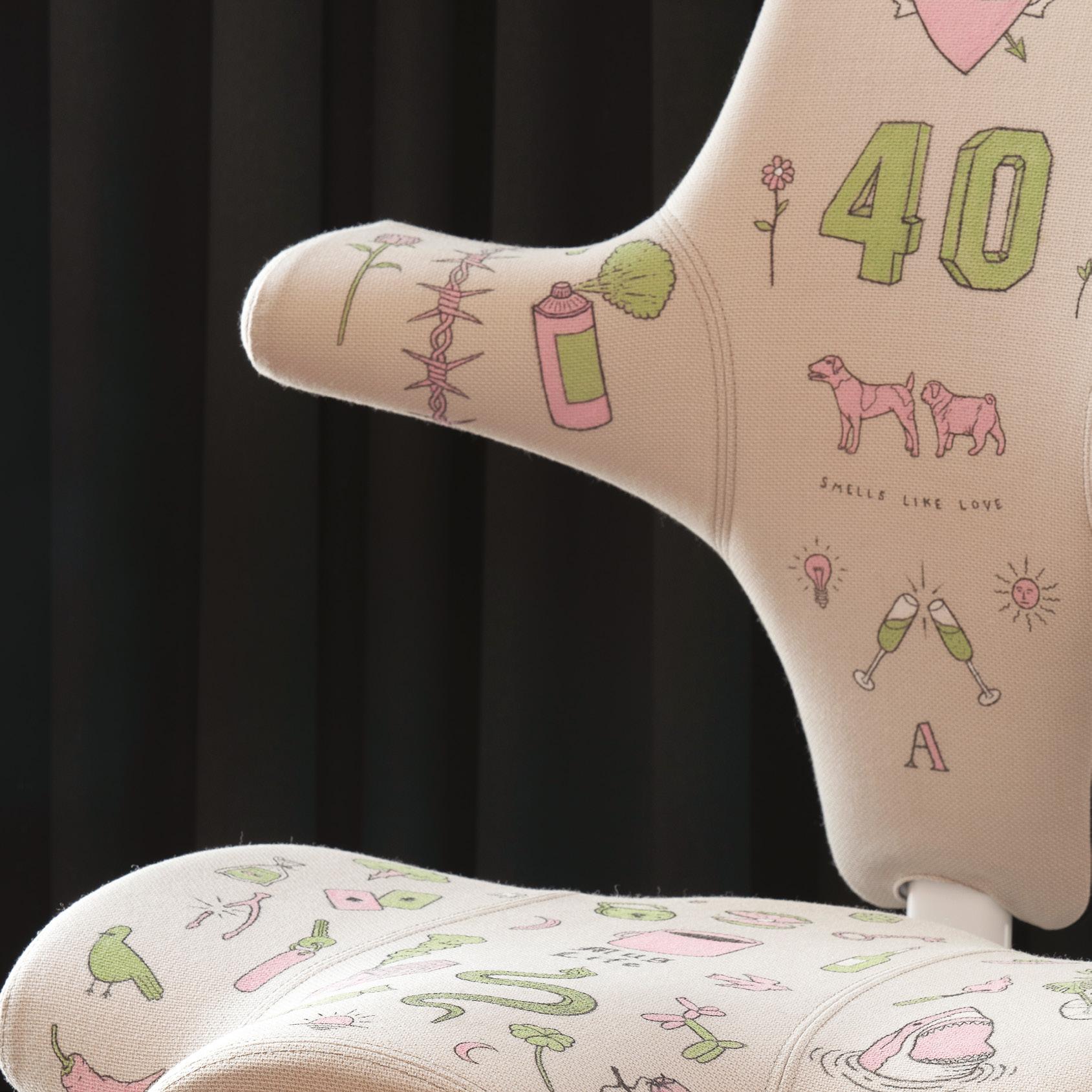 Using vibrant pastel pink and green fabric pens, the studio covered the chair in a handdrawn mix of illustrations. Flames, skulls, flowers, fruit, an anchor, and a large “40” on the backrest are just a few examples layered across the surface in a joyful, spontaneous composition.