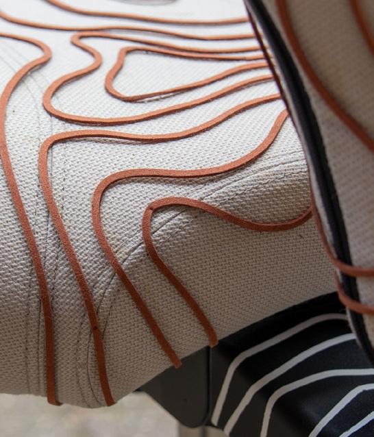 Leather laces are applied with precision to follow the chair’s complex shape, forming a relief reminiscent of topographic maps. Each line is tensioned to highlight the movement and curves of the seat and backrest. Painted contour lines extend the concept onto the base, continuing the visual language of terrain and elevation.