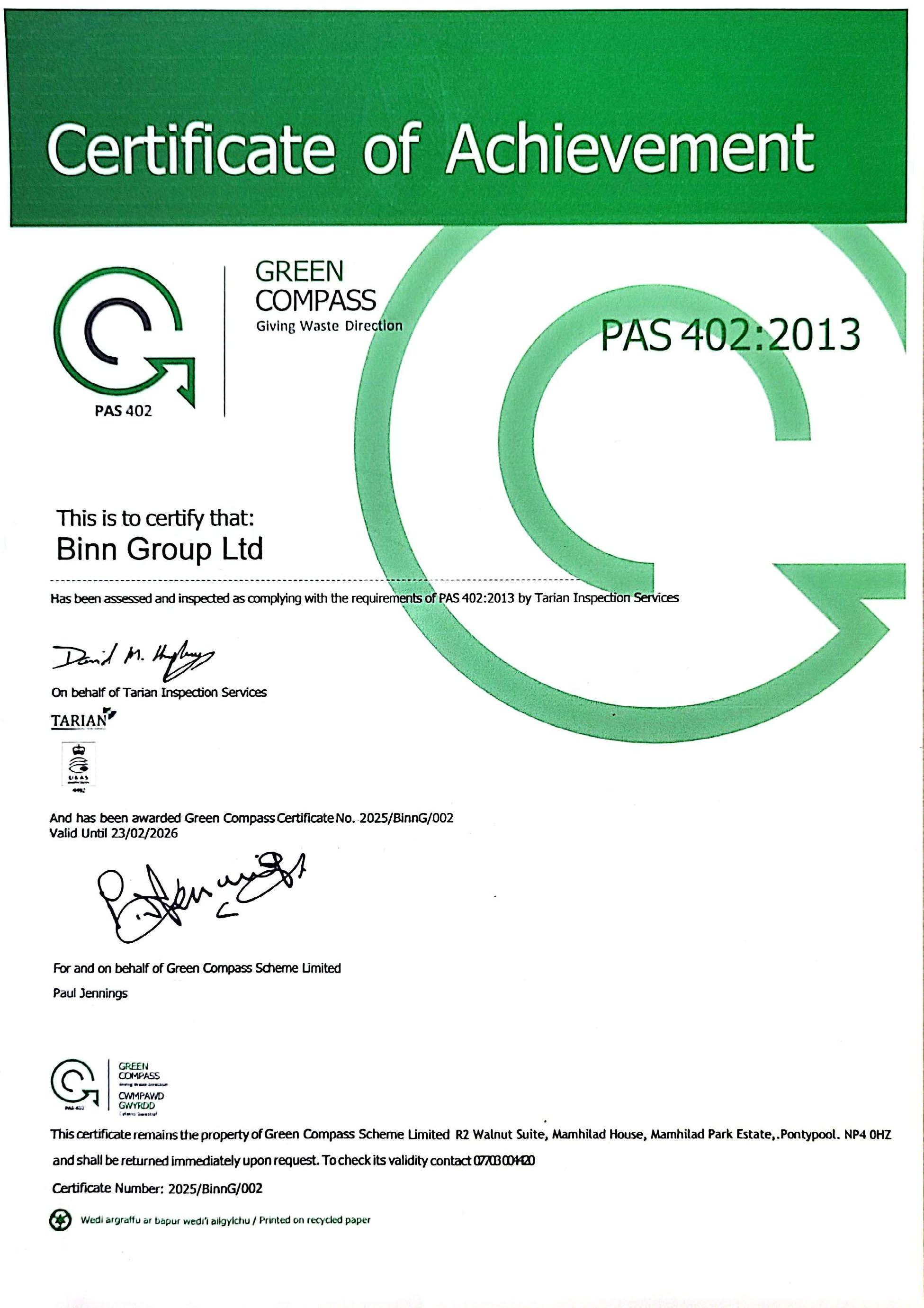 Binn Group, through its waste and resource management services, is committed to achieving the highest standards of service provision for our customers. Our goal is the continuous improvement of our services and we will do this by implementing quality management systems, which conform to ISO 9001, and which incorporate best business practice and regulatory compliance gained from ongoing engagement with customers, regulators, policy makers and other stakeholders.