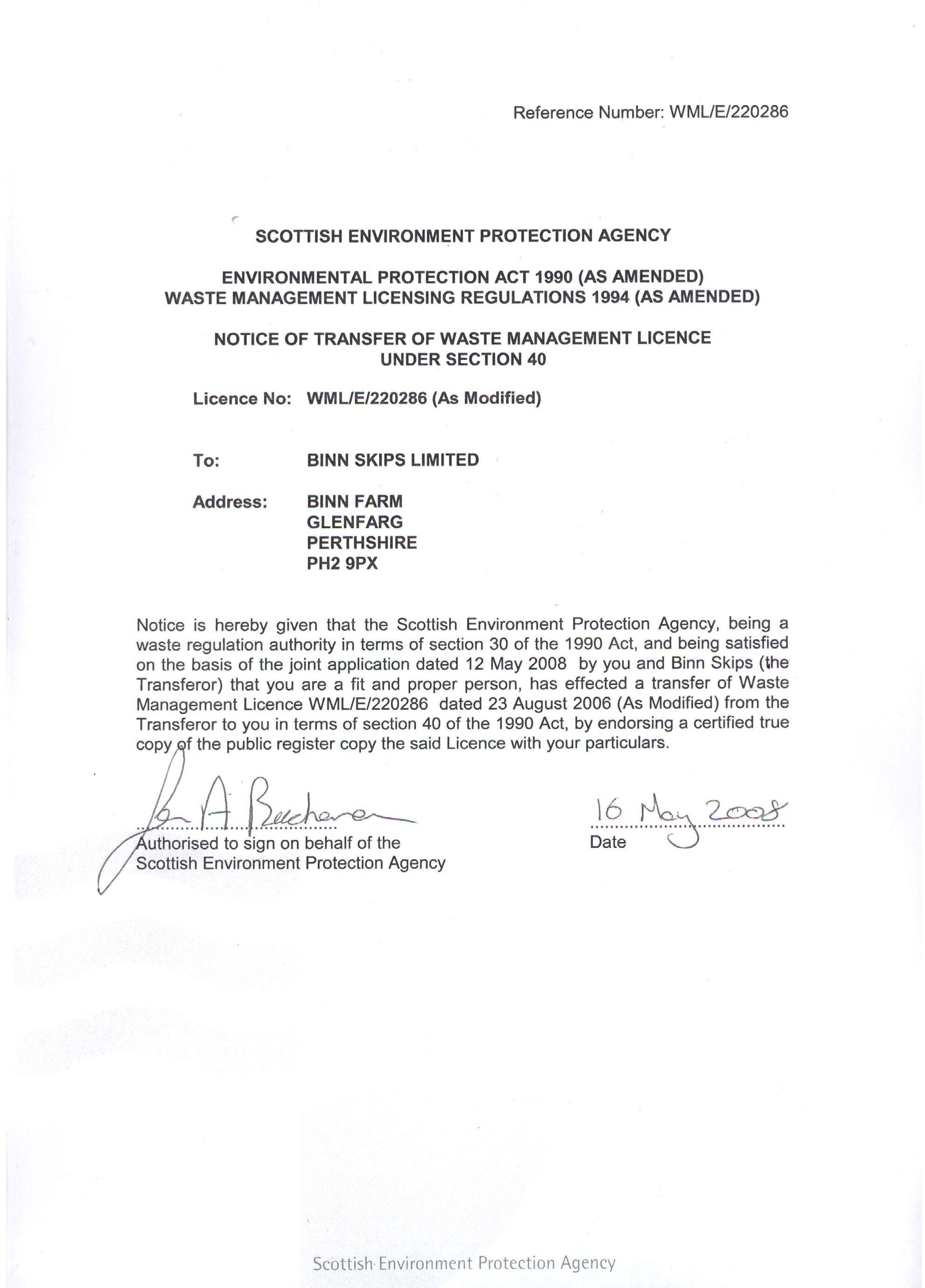 The following information is hereby certified by the Scottish Environment Protection Agency, Angus Smith Building, 6 Parklands Avenue, Eurocentral, Holytown, North Lanarkshire ML1 4WQ to be information which at the date of this certificate is entered in its register of carriers and/or brokers of controlled waste.