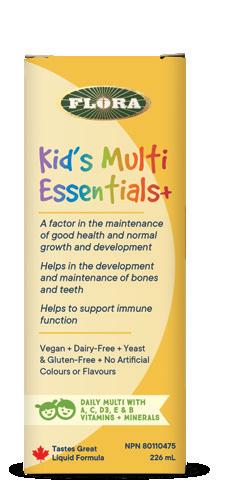 Flora’s Daily Multi Essentials+ and Kid's Multi Essentials+ are rich in antioxidants vitamins A, C and E, and include a full range of B vitamins for energy production. This comprehensive formula also includes a full 400 IU of immune-supporting vitamin D, calcium, and an herbal blend of antioxidant astaxanthin, immune-supporting elderberry, digestion-promoting anise, calming chamomile, and rose hips for extra vitamin C. It comes in a tasty fruit juice and whole food base that’s easy to drink straight or mix into smoothies or juice.