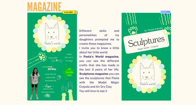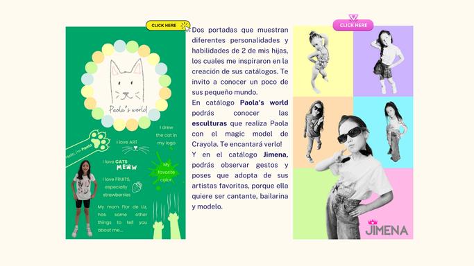Ycomonadaesestático,seguíaprendiendomásdelmundodigitalyeneso unaappllamadoISSUUdespertómiinterésporcrearrevistasycatálagos, entoncesenagostodel2023incorporéenmiwebsiteunaCampaña AmbientalOnlinellamadoEDÚCATE,elnombrenaceporquemuchas personasinmigranaotrospaísesenbuscadenuevasoportunidades,pero muchosdeellostraenconsigolasmalascostumbresqueadquirieronenel transcursodesuvida Realmentenosésileenmisinfografías,peroasíesmi maneradecontribuirconlaconservacióndelplaneta,lohagoconlailusión dequelapersonaquelolea,puedaapreciaryvalorarnuestroentorno. DespuéselaborédoscatálogosinspiradasenmishijasPaolayJimena.