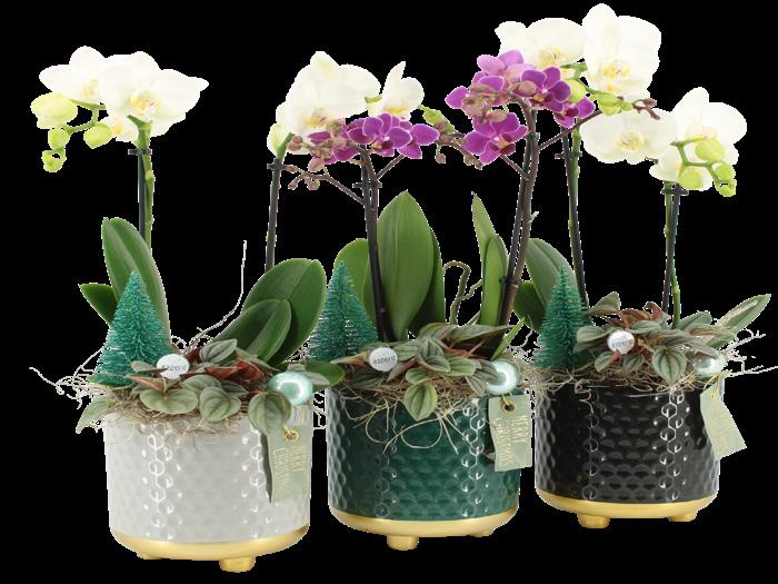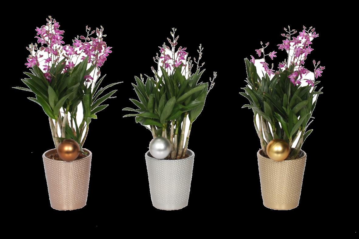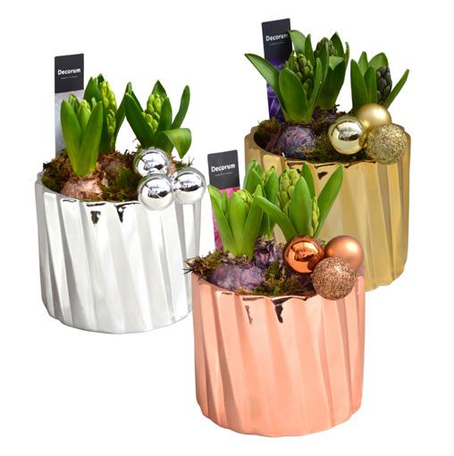 Goud, zilver én brons? Ga voor glamour en magie. Het is dé trend om mee uit te pakken. Stijlvol en toch op en top feestelijk. Verleid uw klanten met pronkstukken die meteen in het oog springen. Met glimmend gouden bijstekers. Met paarse Orchideeën in bronzen keramiek. Het is maar een keer kerst, haal dus alle bling, bling uit de kast.
