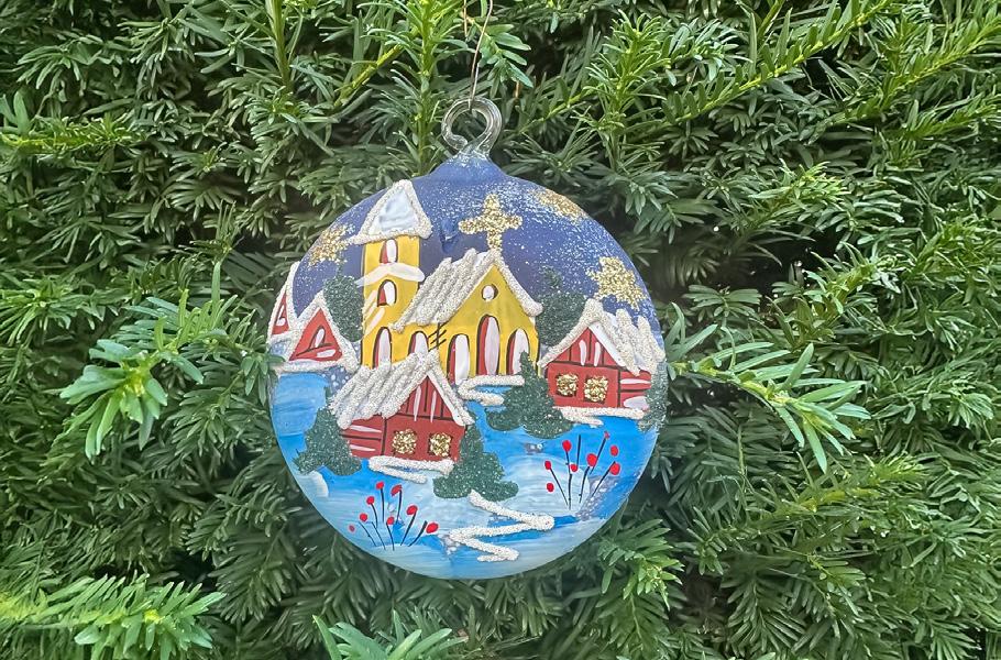 République tchèque : une fragile boule de Noël en verre avec une scène peinte à la main, soigneusement accrochée à l’extrémité du sapin.